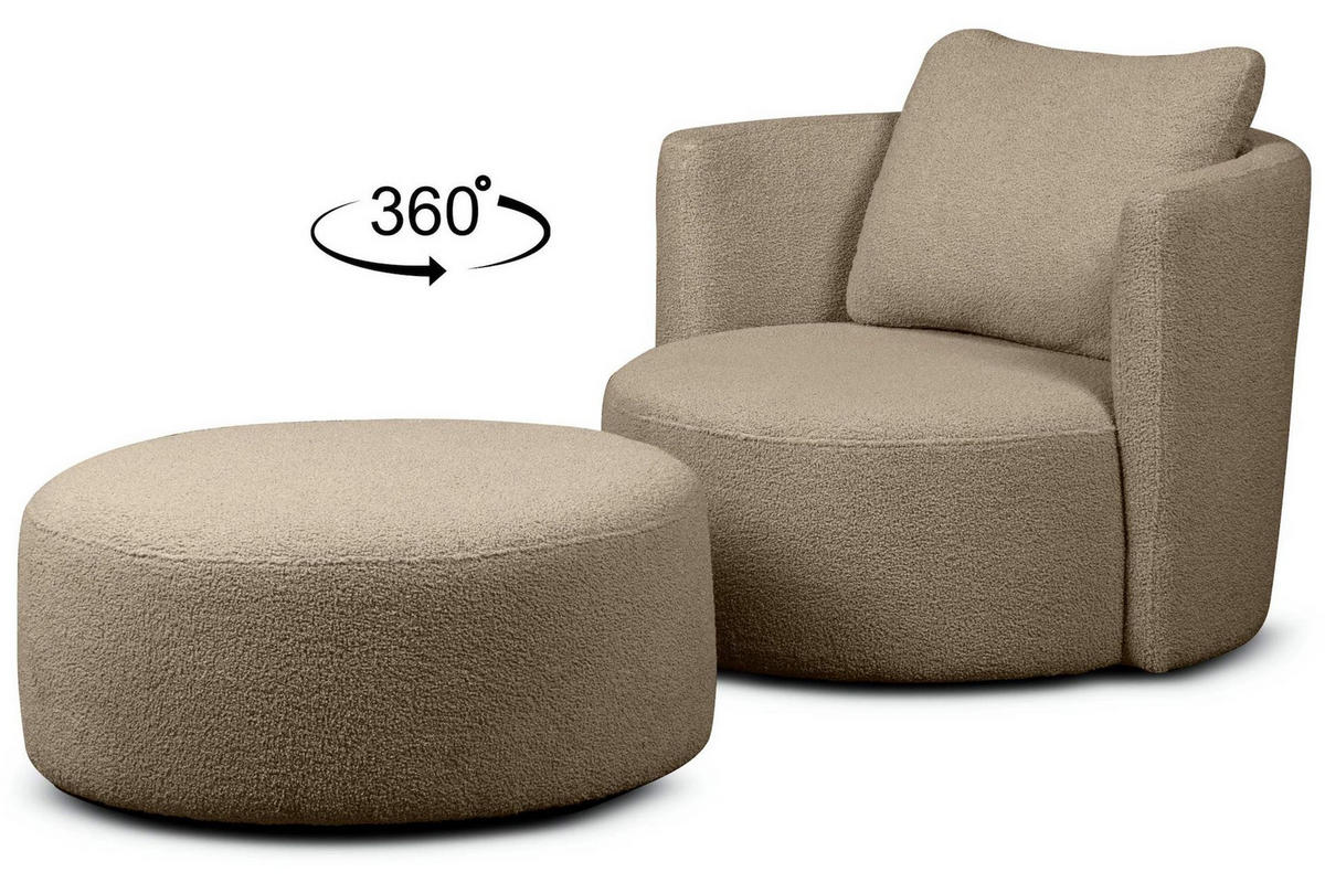 boho-Arrangements. Der Sesselbezug ist aus sogenanntem Bouclé, das sehr angenehm anzufassen ist. Ein zusätzlicher Vorteil ist das dekorative Kissen, auf dem man bequem sitzen kann. Die Form des Sessels mit dem drehbaren