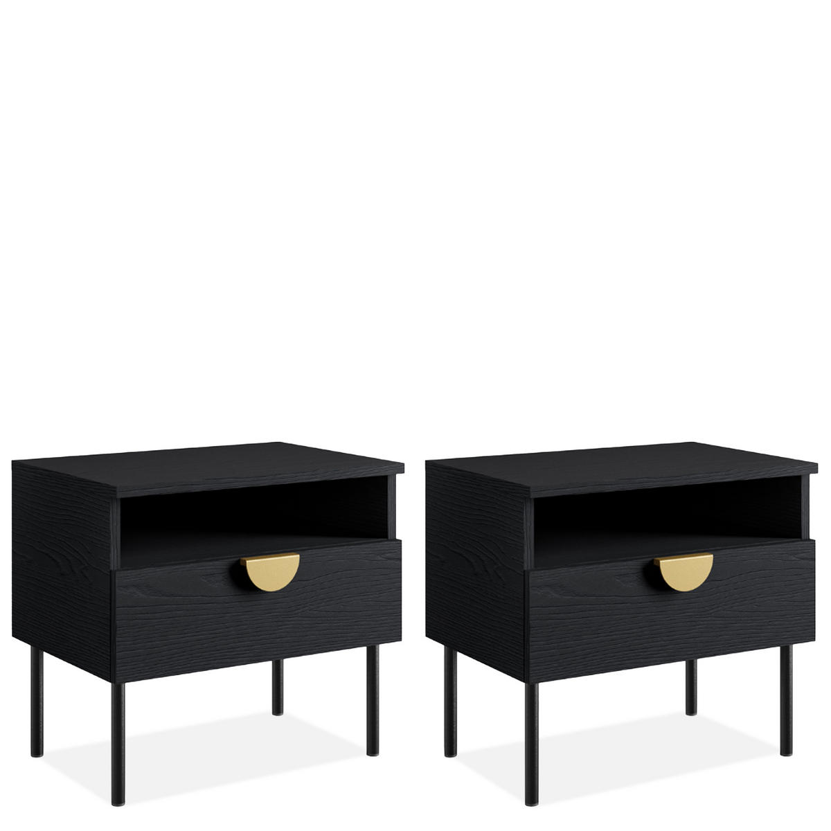 Besondere Design-Highlights sind die halbrunden Griffe in Schwarz oder Gold, die jedem Möbelstück eine elegante Note verleihen. Metallbeine, verdeckte Scharniere, abgerundete ABS-Kanten und eine solide Konstruktion sorgen für Stabilität und Langlebigkeit im täglichen Gebrauch.
