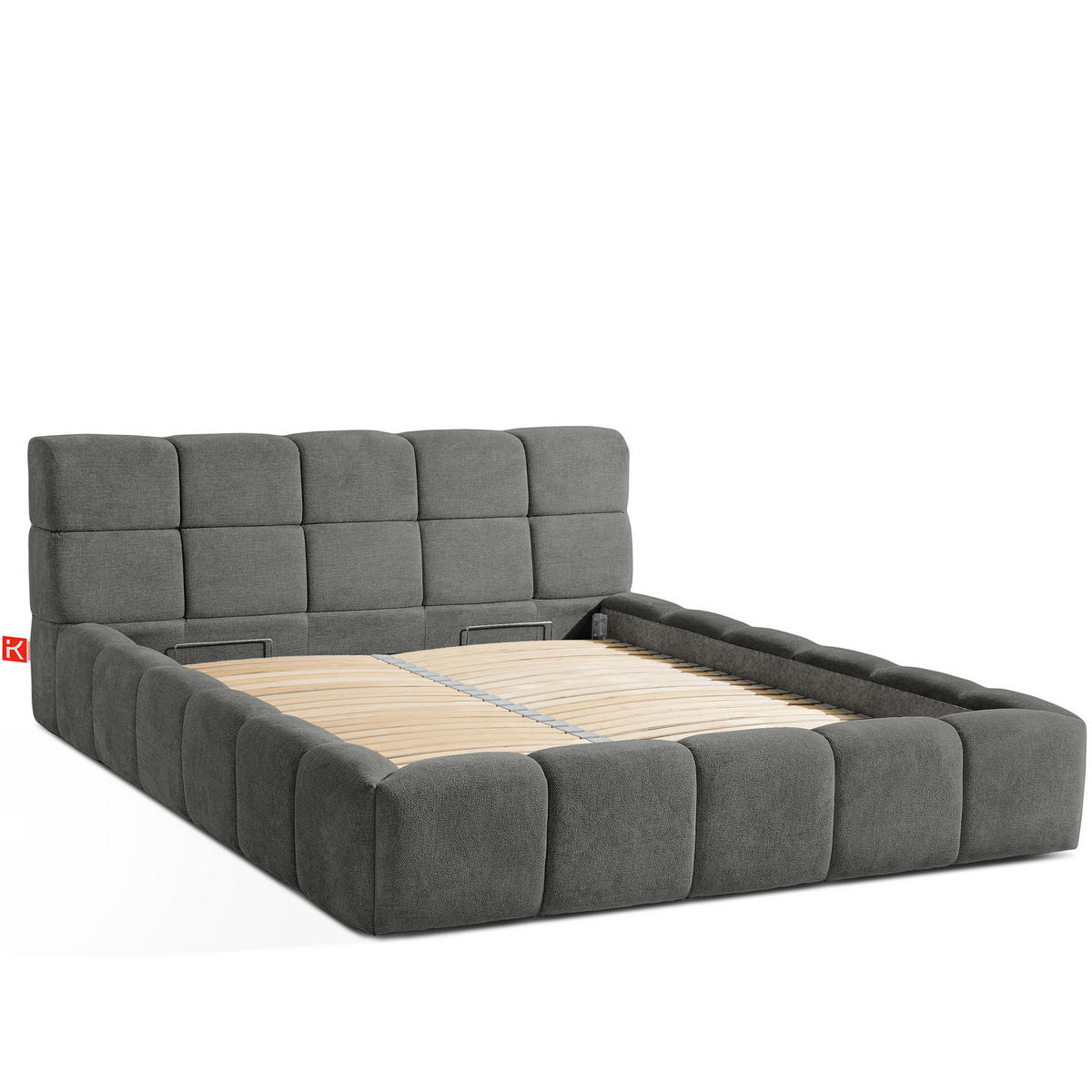 - Ein raffiniert gepolstertes Kopfteil vereint sich mit einem cleveren, per Gasdruckfeder zugänglichen Stauraum.