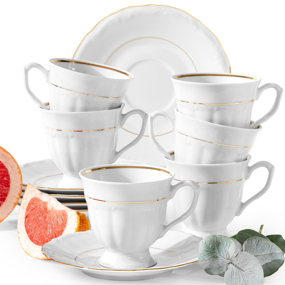 Die mit goldenen Linien verzierte Variante hingegen bringt einen Hauch von Luxus und Prestige in die Einrichtung und macht jeden Anlass zu etwas Besonderem. Aufgrund der Feinheit des Golddekors sollten diese Stücke jedoch mit der Hand gewaschen und nicht in der Mikrowelle verwendet werden, um ihre Schönheit und Haltbarkeit über Jahre hinweg zu erhalten.