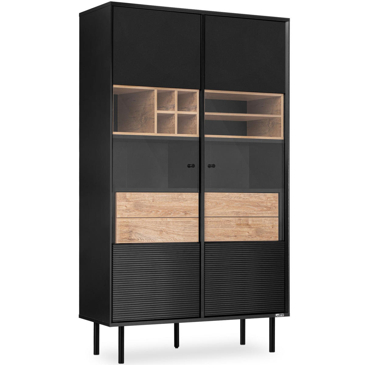 Die LOFTY-Kollektion ist das Werk angesehener Professoren, die sie so vielseitig und anpassungsfähig wie möglich gestaltet haben. Die Möbel sind mit verschiedenen Arten von Regaleinsätzen ausgestattet, die sich in Form und Farbe unterscheiden. Auch die LOFTY-Kollektion enttäuscht nicht, was die Verarbeitung angeht. Ausgewählte hochwertige Materialien sorgen für Stabilität und eine einzigartige Optik. Ebenso wichtig ist die Kombination aus schwarzem Laminat und eichenfarbenem Dekor, die perfekt zusammenpassen. Die Kollektion ist nicht nur für den rohen Industriestil, sondern auch für den wärmeren Loft-Stil geeignet. Der Loft RTV-Schrank in Eiche natur/schwarz ist in erster Linie ein Möbelstück für Nutzer, die Wert auf Details und hochwertige Verarbeitung legen. .