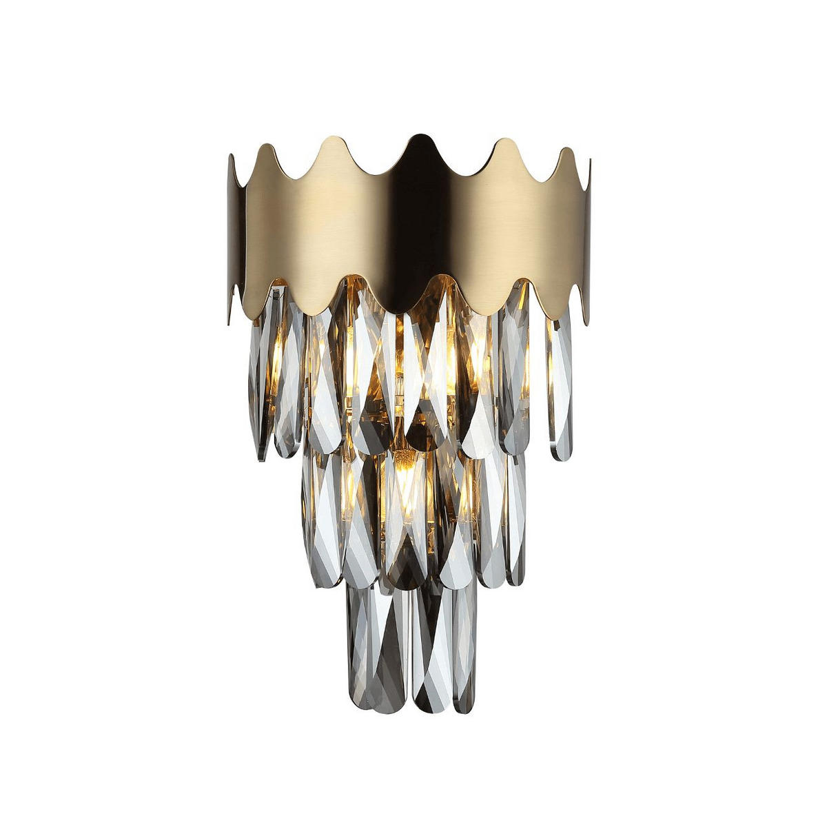 Wandleuchte Graziano aus mehreren Rauchglasranken, die an einer goldfarbenen Metallstruktur befestigt sind. Eine hübsche Halterung mit wellenförmigen Formen schmückt die Wandleuchte. Die ultramoderne Leuchte ist 39 cm hoch und 26 cm breit. Sie funktioniert mit 3 E14-Glühbirnen. Die Gläser ermöglichen Reflexionen im ganzen Raum. Die Beleuchtung ist angenehm und blendfrei. Sie ist eine sehr schicke Wandleuchte, die auch nach dem Ausschalten noch genauso schön anzusehen ist. Kombinieren Sie die Wandleuchte und den Kronleuchter Graziano für ein schönes, harmonisches Ensemble! (Montage erforderlich durch den Kunden)