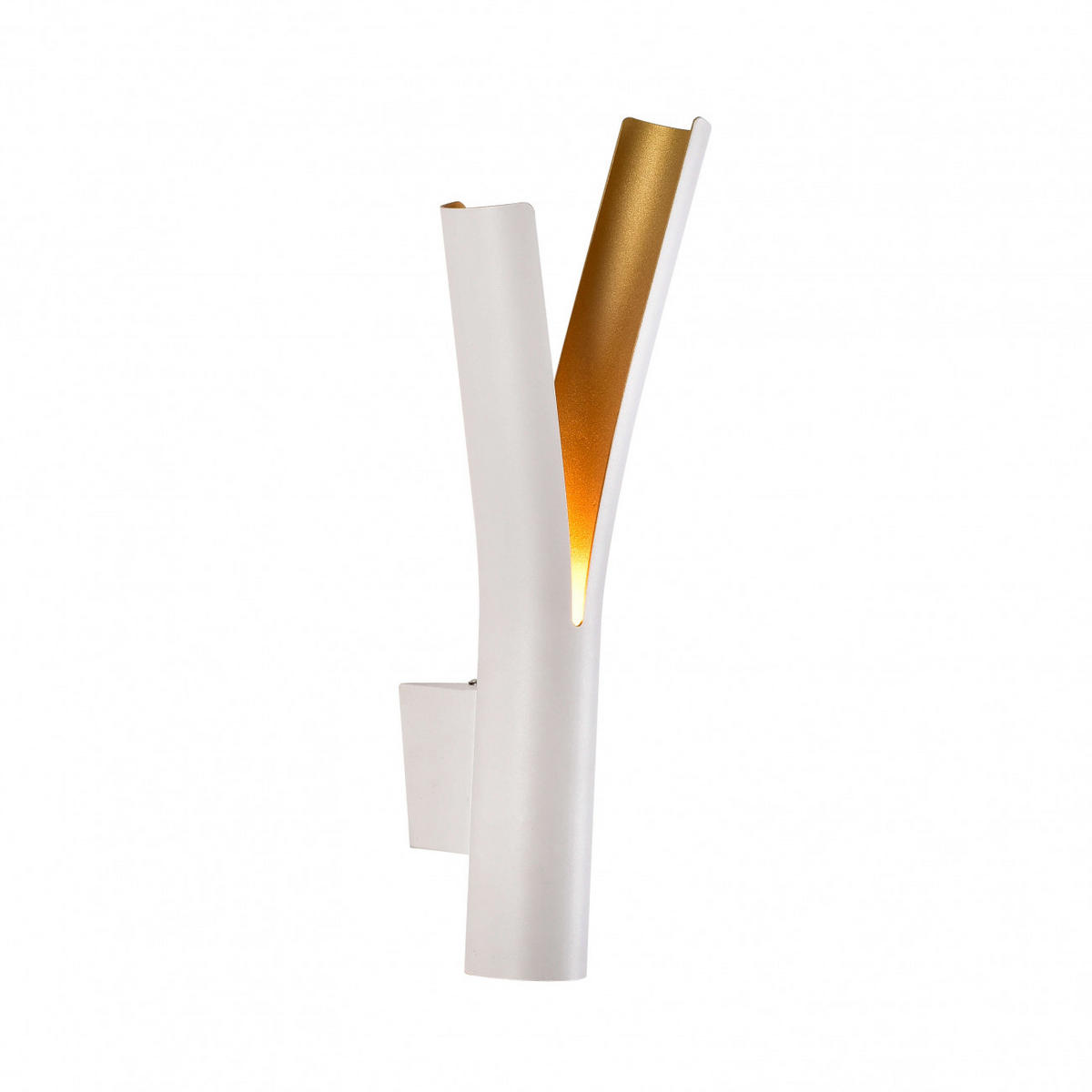 Y-förmige Wandleuchte, die aus zwei nach oben und unten gerichteten Lichtpunkten besteht. Die Oberfläche ist außen weiß und innen goldfarben. Die offene Form der Leuchte ermöglicht eine bessere Lichtstreuung. Die Lichtquellen befinden sich bereits im Inneren, da die Leuchte mit eingebauten LEDs ausgestattet ist, die von einem kleinen Transformator im Sockel gespeist werden. Diese Wandbeleuchtung ist aus hochwertigem Aluminium gefertigt. Entdecken Sie auch die schwarze Version von Nelia. (Sofort einsatzbereit)
