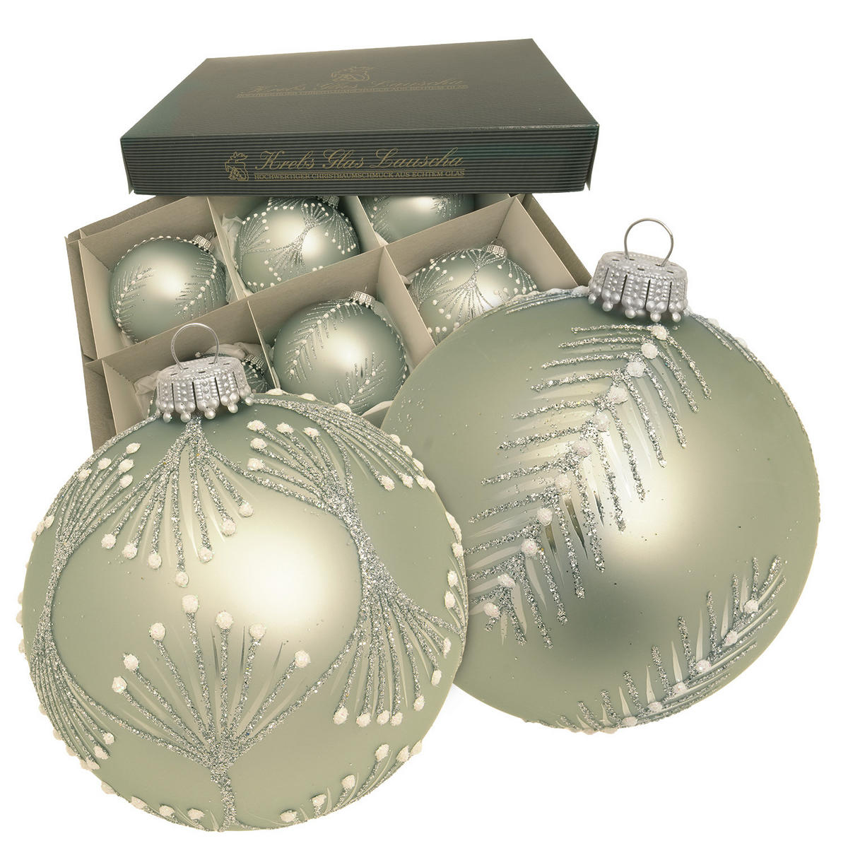 Krebs Glas Lauscha CHRISTBAUMKUGELN Kugeln Frostige Zweige Grün 8cm (Glas / 6 Stk.)