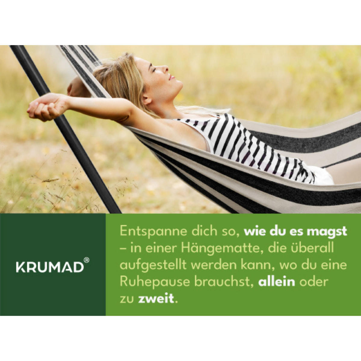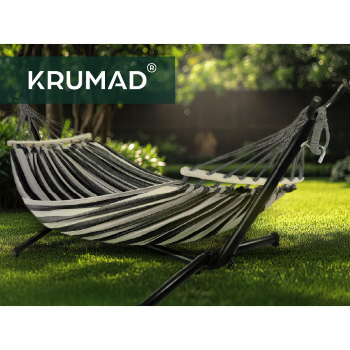 Die KRUMAD Hängematte mit Gestell ist die perfekte Wahl für eine komfortable und stabile Erholung im Garten, auf dem Balkon, der Terrasse oder beim Camping. Dank des robusten Stahlgestells und einer Tragfähigkeit von 200 kg bietet sie Platz für zwei Personen und sorgt für maximale Sicherheit und Langlebigkeit.