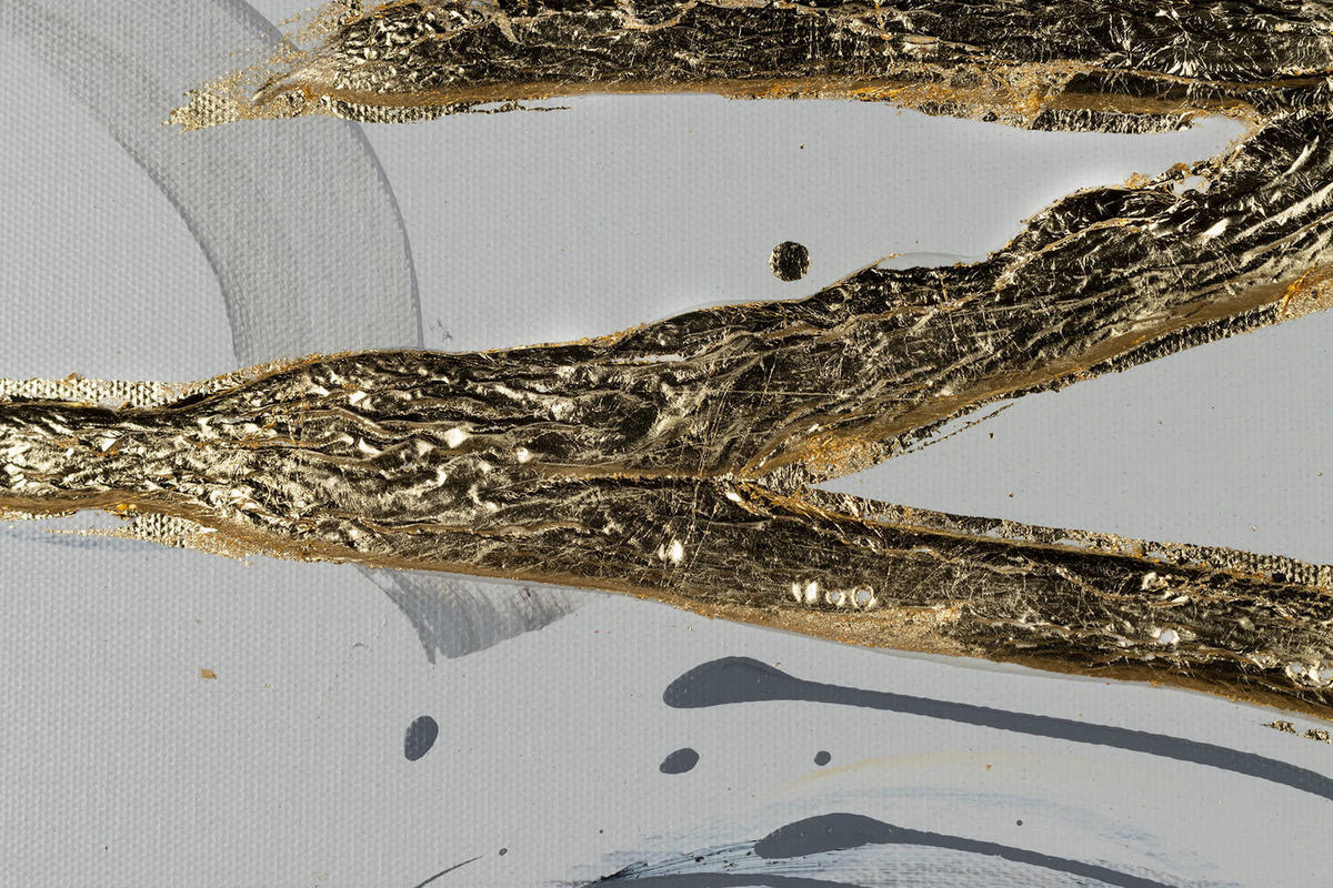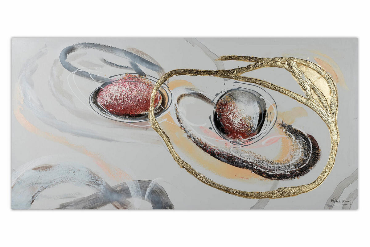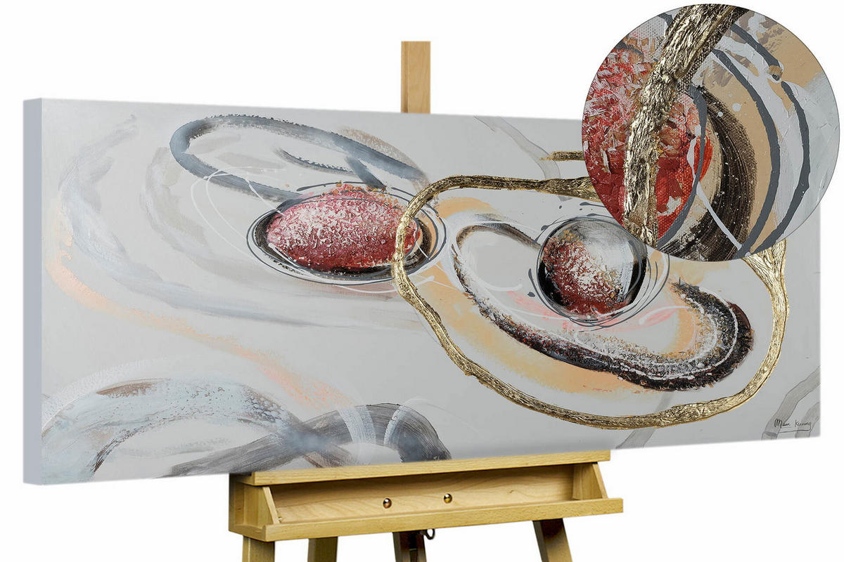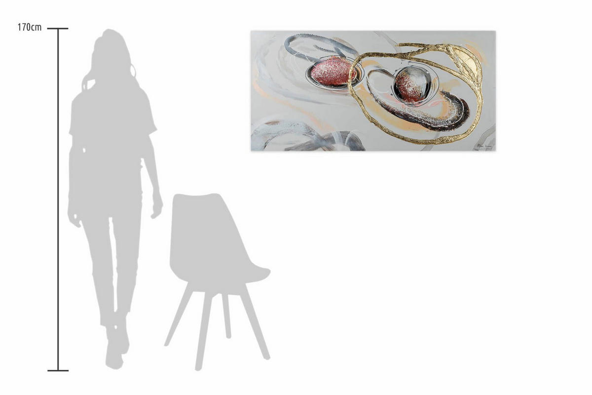 In Ihrem Raum wird das handgemalte Acrylgemälde 'Hovering Spheres' mit der Verzierung Goldglanz, Holzelemente und der leuchtenden Brillanz seiner Farben alle Blicke auf sich ziehen. Als Betrachter spüren Sie, dass der Künstler jeden Pinselstrich in Gold und Weiß mit Liebe zum Detail gesetzt hat, wodurch sich jedes Bild in Nuancen von anderen unterscheidet. Das Leinwandbild ist Ausdruck Ihrer Persönlichkeit und wertet Ihren Raum auf, da durch den abwechslungsreichen Farbauftrag eine spannende Oberflächenstruktur entsteht. Ihr handgemaltes Gemälde erhalten Sie in der Größe 120x60cm. Anders als bei minderwertigen Drucken auf Leinwand können Sie auf unseren Unikaten jeden Pinselstrich fühlen.