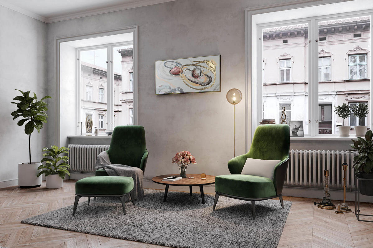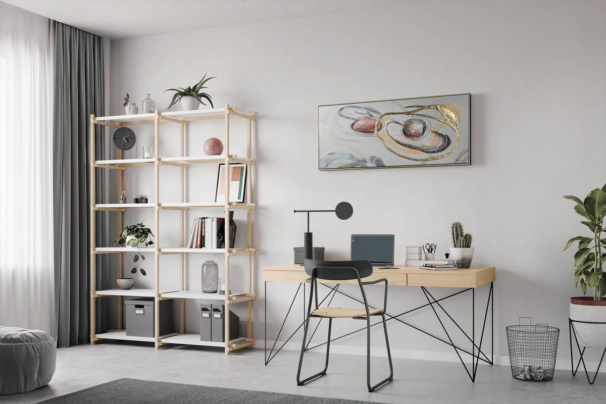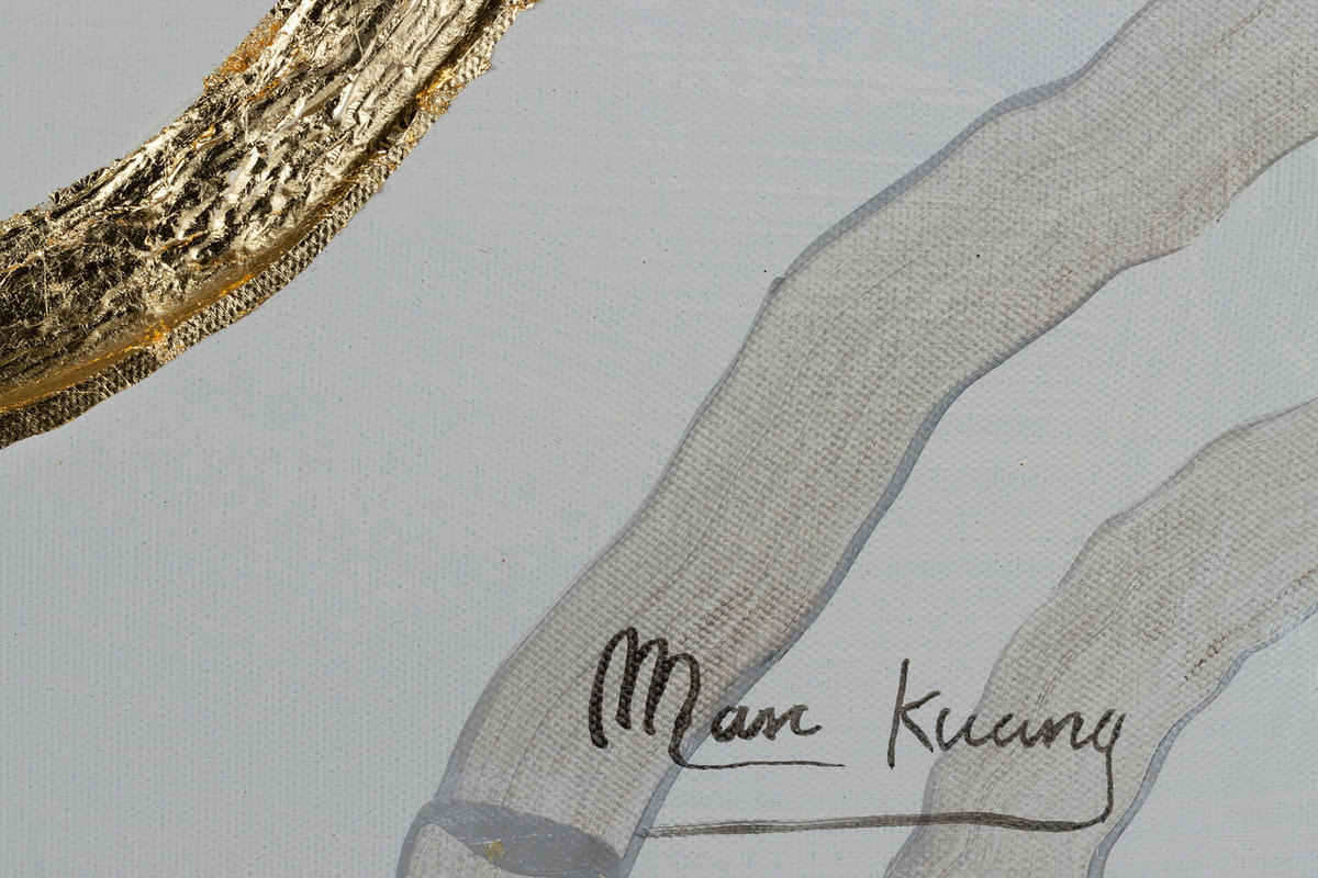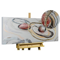 In Ihrem Raum wird das handgemalte Acrylgemälde 'Hovering Spheres' mit der Verzierung Goldglanz, Holzelemente und der leuchtenden Brillanz seiner Farben alle Blicke auf sich ziehen. Als Betrachter spüren Sie, dass der Künstler jeden Pinselstrich in Gold und Weiß mit Liebe zum Detail gesetzt hat, wodurch sich jedes Bild in Nuancen von anderen unterscheidet. Das Leinwandbild ist Ausdruck Ihrer Persönlichkeit und wertet Ihren Raum auf, da durch den abwechslungsreichen Farbauftrag eine spannende Oberflächenstruktur entsteht. Ihr handgemaltes Gemälde erhalten Sie in der Größe 120x60cm. Anders als bei minderwertigen Drucken auf Leinwand können Sie auf unseren Unikaten jeden Pinselstrich fühlen.