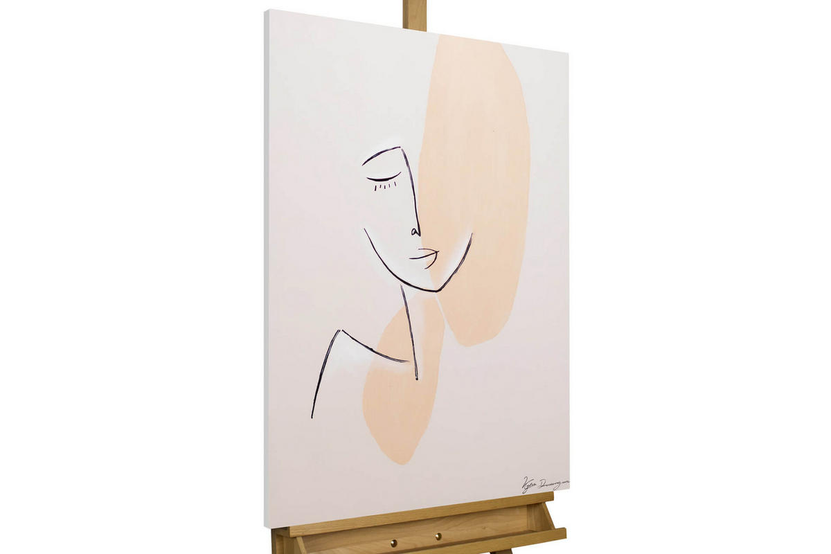Im Minimalismus sind es die Details, die den Betrachter besonders anziehen. Auf dem handgemalten Acrylbild 'Strong Subconscious' in Rosa ist es das im Stil der Linienkunst skizzierte Gesicht einer Frau, die mit ihrer Mimik voller Gelassenheit alle Aufmerksamkeit fesselt und mit ihrer bedächtigen Schönheit in Ihrem Schlafzimmer fasziniert. Ihr handgemaltes Gemälde erhalten Sie in der Größe 60x90cm. Anders als bei minderwertigen Drucken auf Leinwand können Sie auf unseren Unikaten jeden Pinselstrich fühlen.