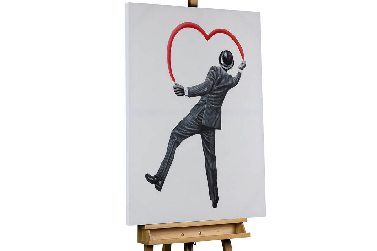 In Ihrem Raum wird das handgemalte Acrylgemälde 'Banksy's Man in Love' mit der leuchtenden Brillanz seiner Farben alle Blicke auf sich ziehen. Als Betrachter spüren Sie, dass der Künstler jeden Pinselstrich in Rot mit Liebe zum Detail gesetzt hat, wodurch sich jedes Bild in Nuancen von anderen unterscheidet. Das Leinwandbild ist Ausdruck Ihrer Persönlichkeit und wertet Ihren Raum auf, da durch den abwechslungsreichen Farbauftrag eine spannende Oberflächenstruktur entsteht. Ihr handgemaltes Gemälde erhalten Sie in der Größe 75x100cm. Anders als bei minderwertigen Drucken auf Leinwand können Sie auf unseren Unikaten jeden Pinselstrich fühlen.