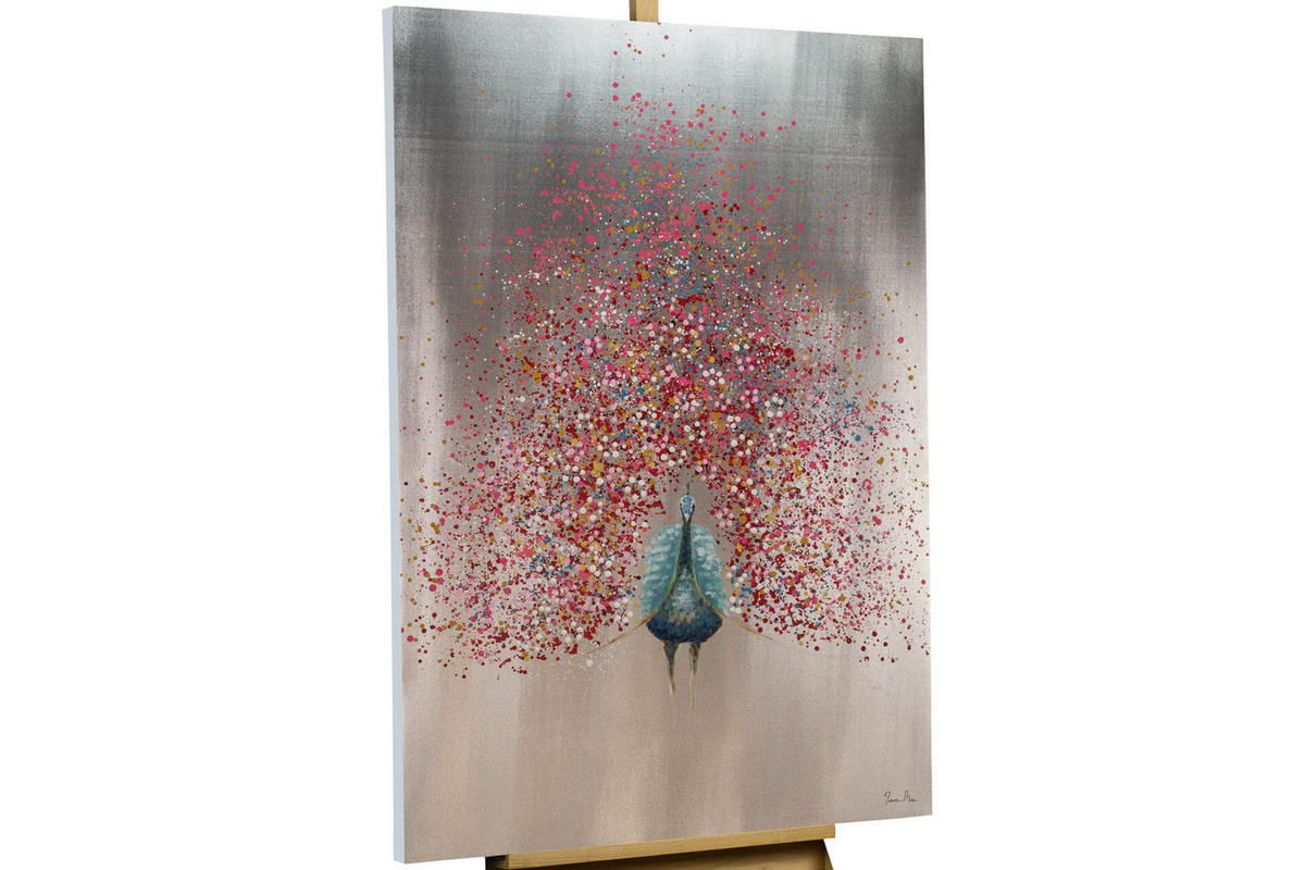 Das Rad des handgemalten Pfaus auf dem grauen Acrylgemälde besteht anstelle von Federn aus abertausenden rosafarbenen, mit Silberglanz verzierten Farbtupfen, die Blüten ähneln. Die Lebensfreude und Wärme, die durch die Kolorierung und das hoheitsvolle Tier transportiert werden, machen den 'Vogel des Frühlings' zu einem echten Hingucker in Ihrem Schlafzimmer. Ihr handgemaltes Gemälde erhalten Sie in der Größe 80x120cm. Anders als bei minderwertigen Drucken auf Leinwand können Sie auf unseren Unikaten jeden Pinselstrich fühlen.