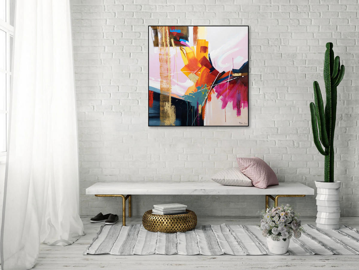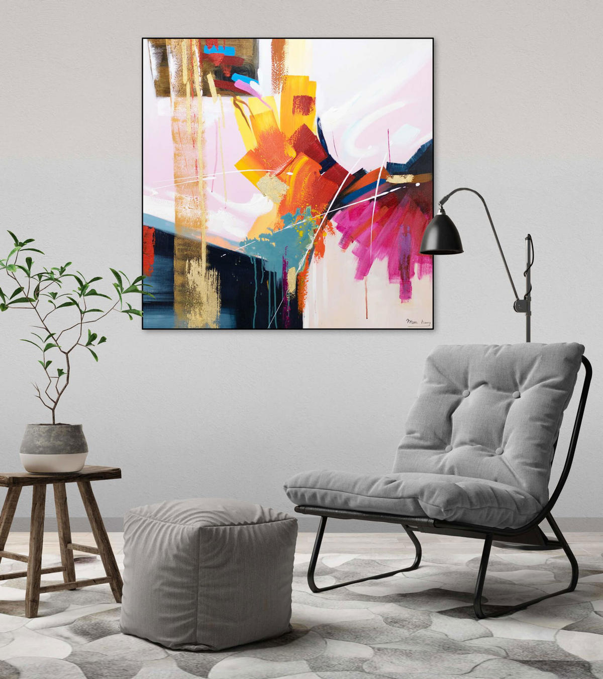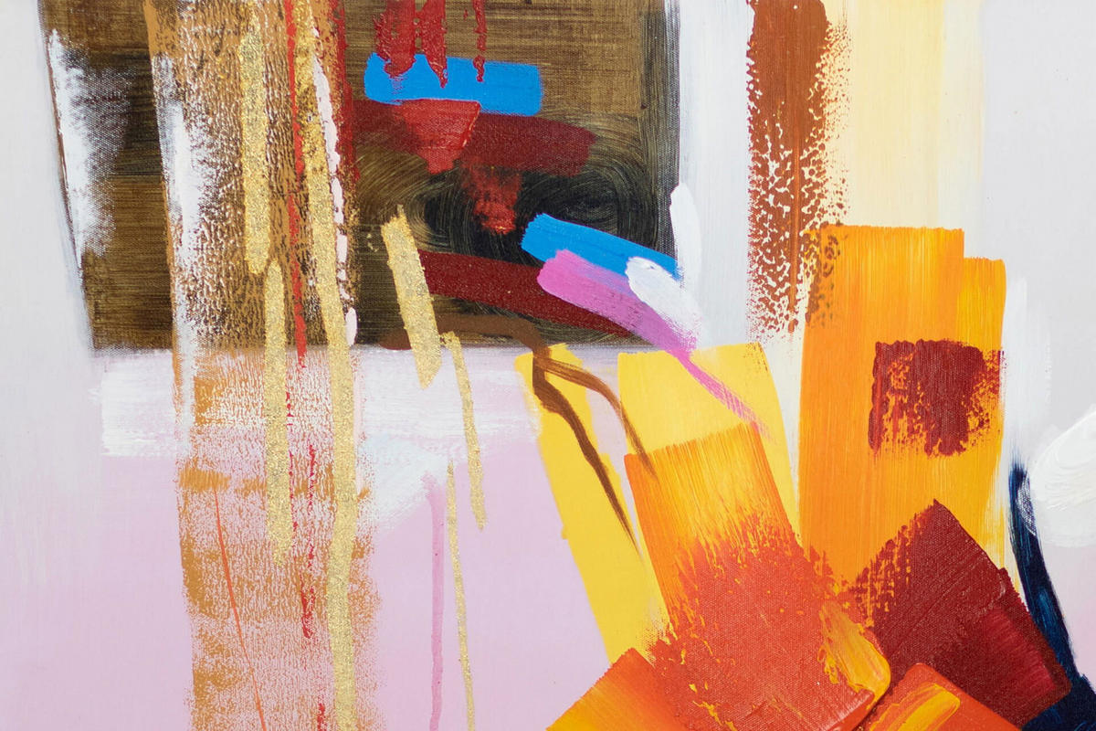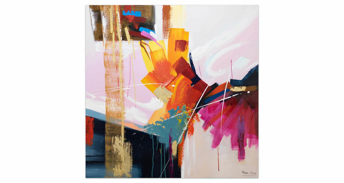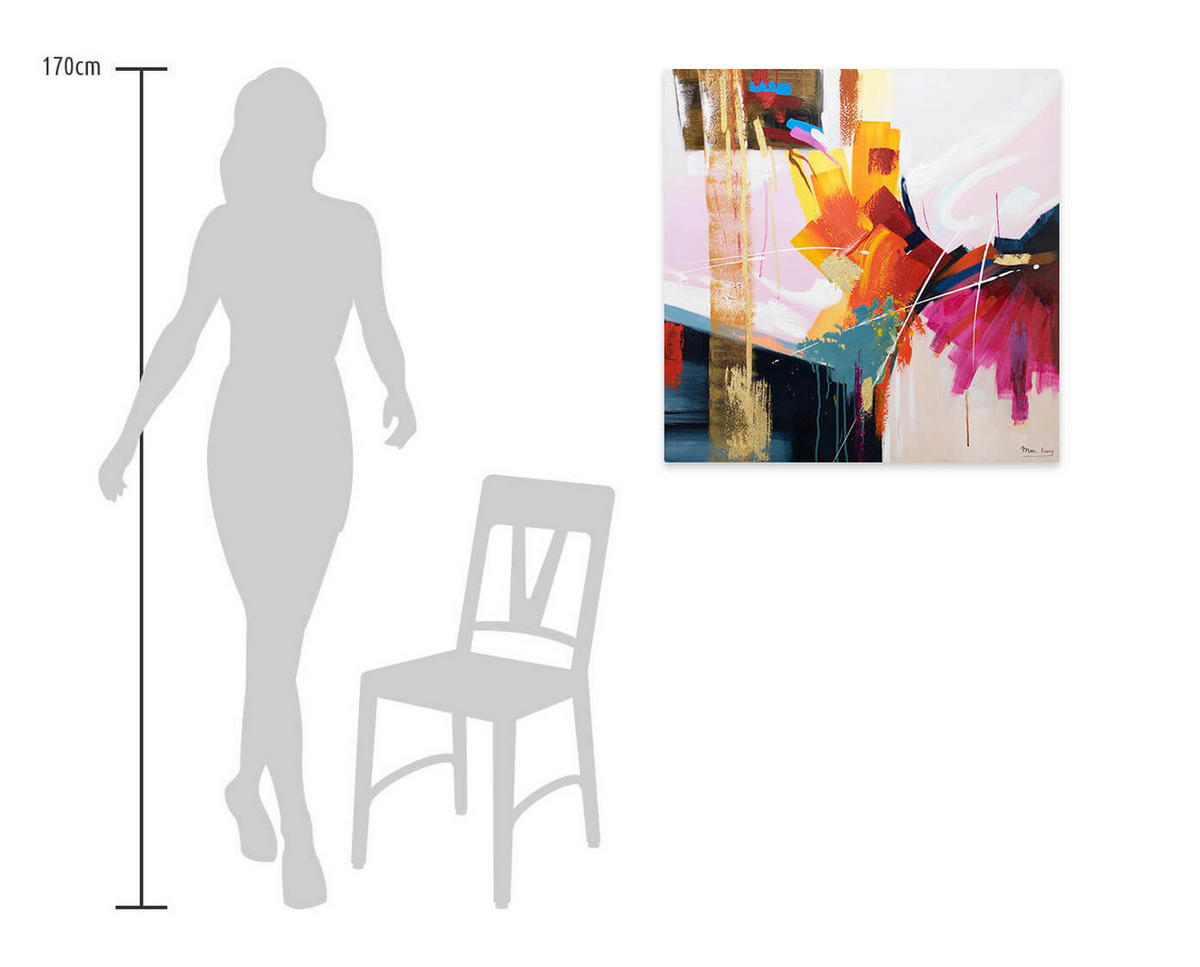 Ein handgemaltes Farbgewitter entlädt sich auf dem Ölgemälde in voller Wucht und lässt den Betrachter staunend zurück. Die explosive Buntheit des Bildes zeigt sich in der Überlagerung von Kolorierung und abstrakter Komposition und stellt eine 'Passion der Farben' dar, die Vitalität und Ausdruckskraft an die Wände Ihres Büros bringt. Ihr handgemaltes Gemälde erhalten Sie in der Größe 80x80cm. Anders als bei minderwertigen Drucken auf Leinwand können Sie auf unseren Unikaten jeden Pinselstrich fühlen.