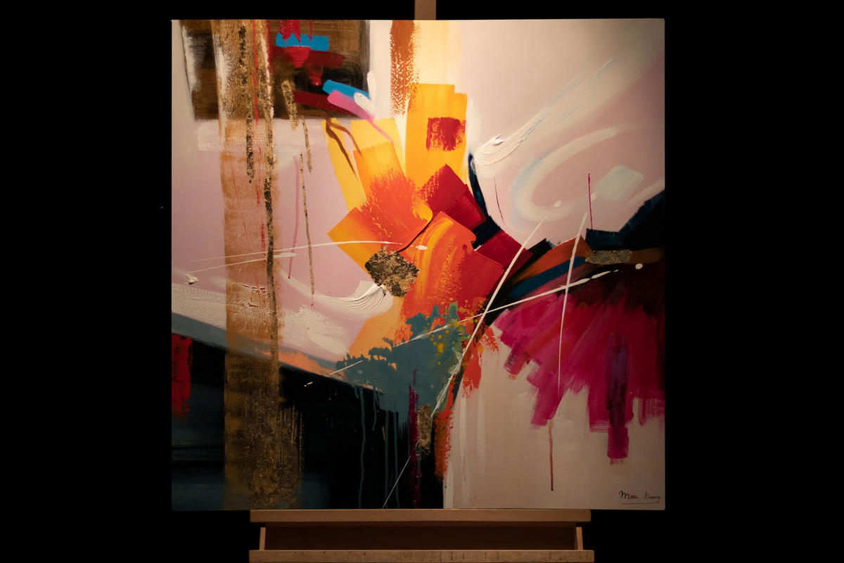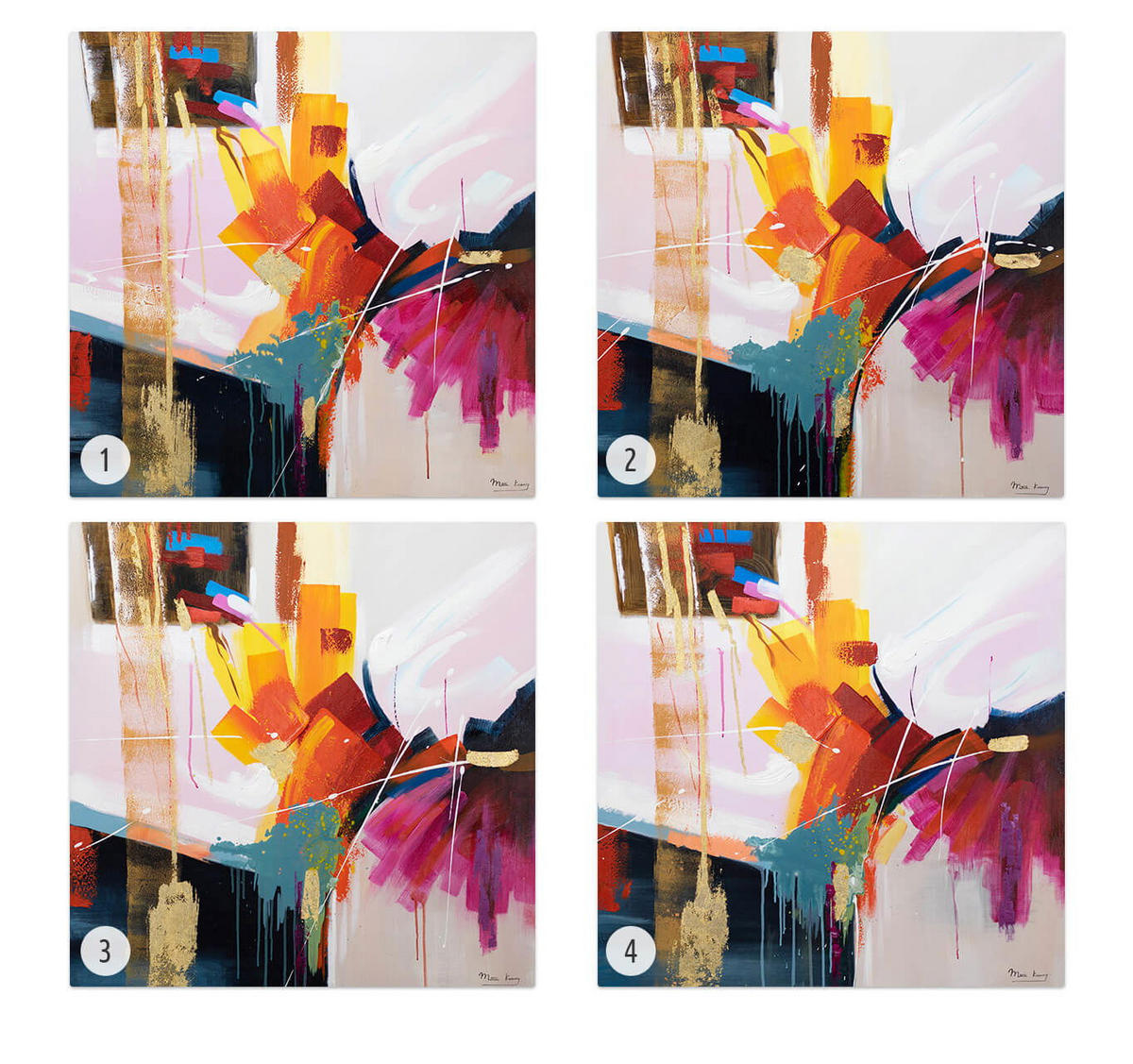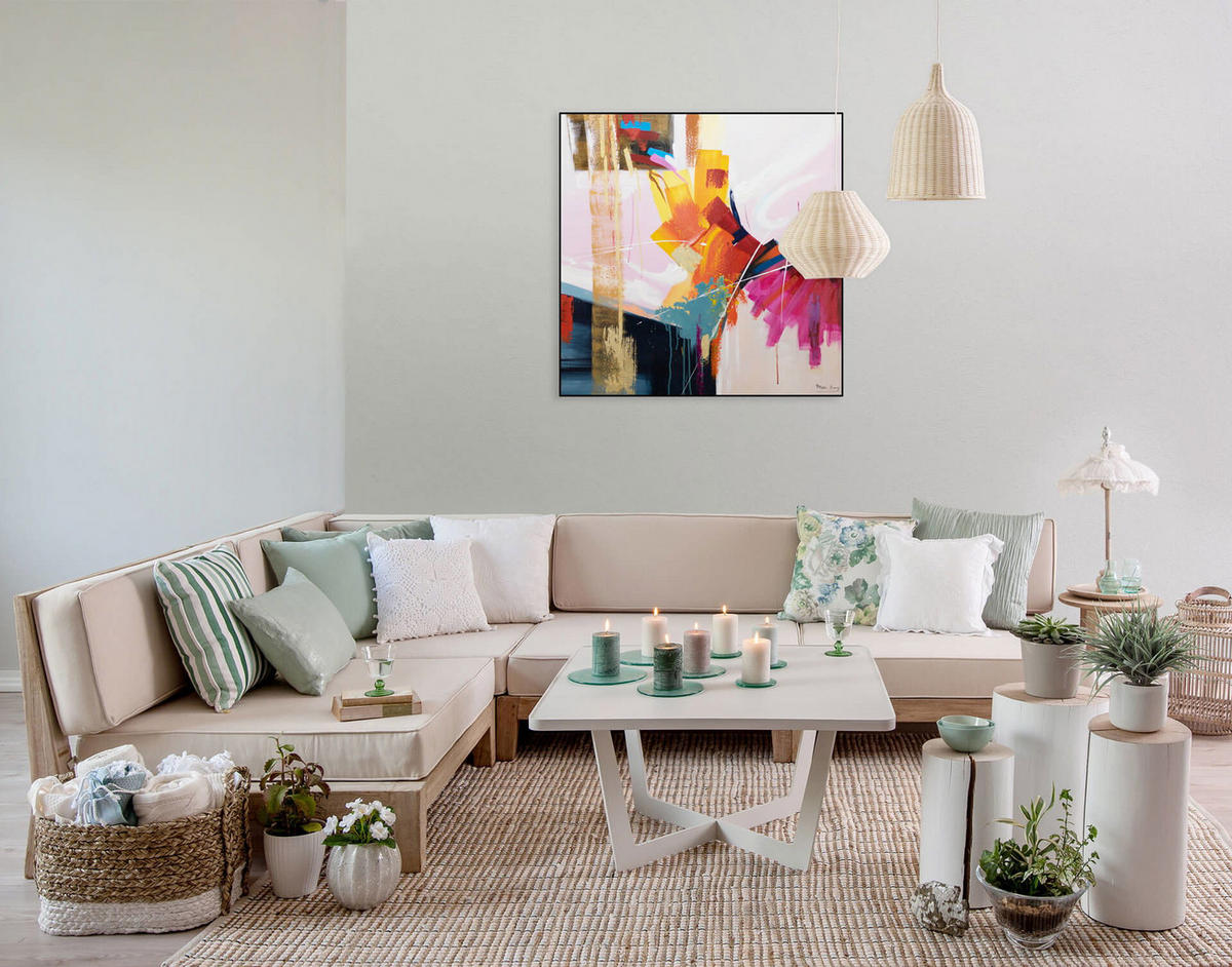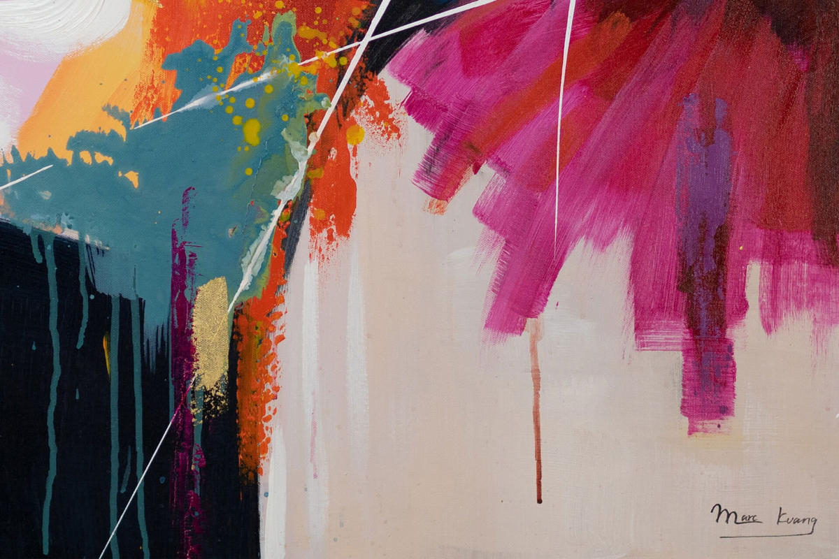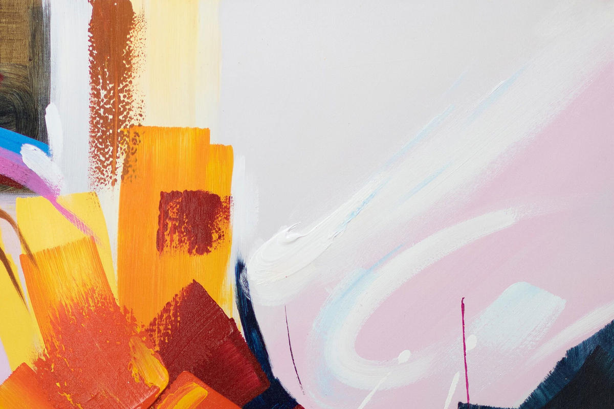 Ein handgemaltes Farbgewitter entlädt sich auf dem Ölgemälde in voller Wucht und lässt den Betrachter staunend zurück. Die explosive Buntheit des Bildes zeigt sich in der Überlagerung von Kolorierung und abstrakter Komposition und stellt eine 'Passion der Farben' dar, die Vitalität und Ausdruckskraft an die Wände Ihres Büros bringt. Ihr handgemaltes Gemälde erhalten Sie in der Größe 80x80cm. Anders als bei minderwertigen Drucken auf Leinwand können Sie auf unseren Unikaten jeden Pinselstrich fühlen.