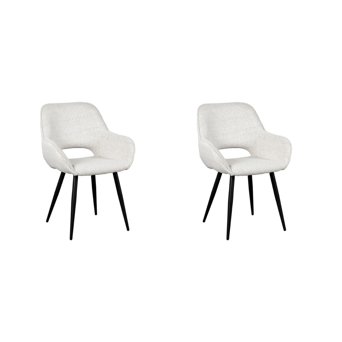 Fer, hergestellt aus Champagner-Bouclé, hat eine runde Form Sitz mit eleganten Kurven. Die schöne „Kurve“ vom Sitz bis zur Armlehne und Rückenlehne verleiht diesem Stuhl viel Charme und Komfort. Die schöne Aussparung in der Rückenlehne verleiht dem Stuhl einen luftigen und verspielten Charakter. Die schwarzen, nach außen stehenden Beine sorgen dafür, dass der Stuhl schön stabil auf dem Boden steht und tragen auch zur schönen verspielten Note bei.