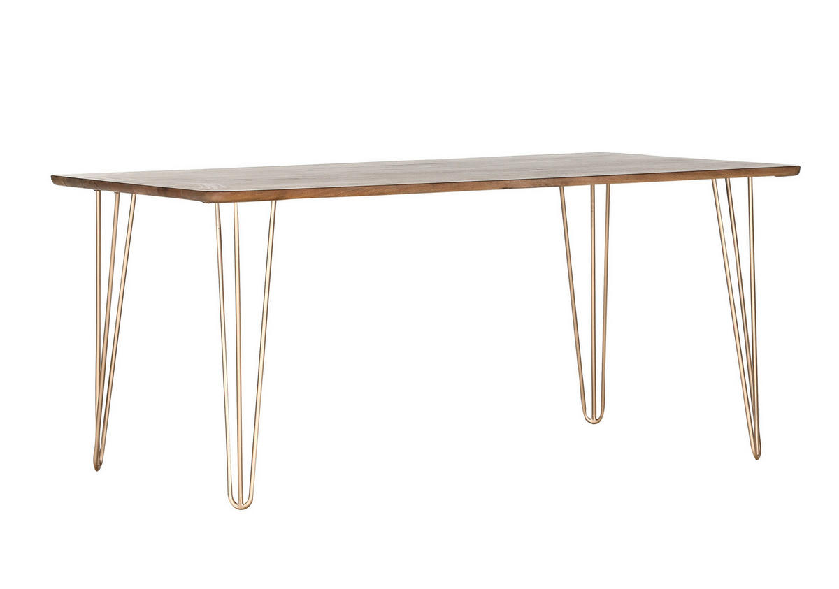 Mit diesem Esstisch aus massivem Mangoholz (B x H x T: ca. 160 x 76 x 90 cm) holen Sie sich das Flair vergangener Zeiten ins Esszimmer. Die lackierte Tischplatte mit ihrer markanten Färbung thront dabei auf 4 Hairpin Legs aus Eisen in Goldfarben.