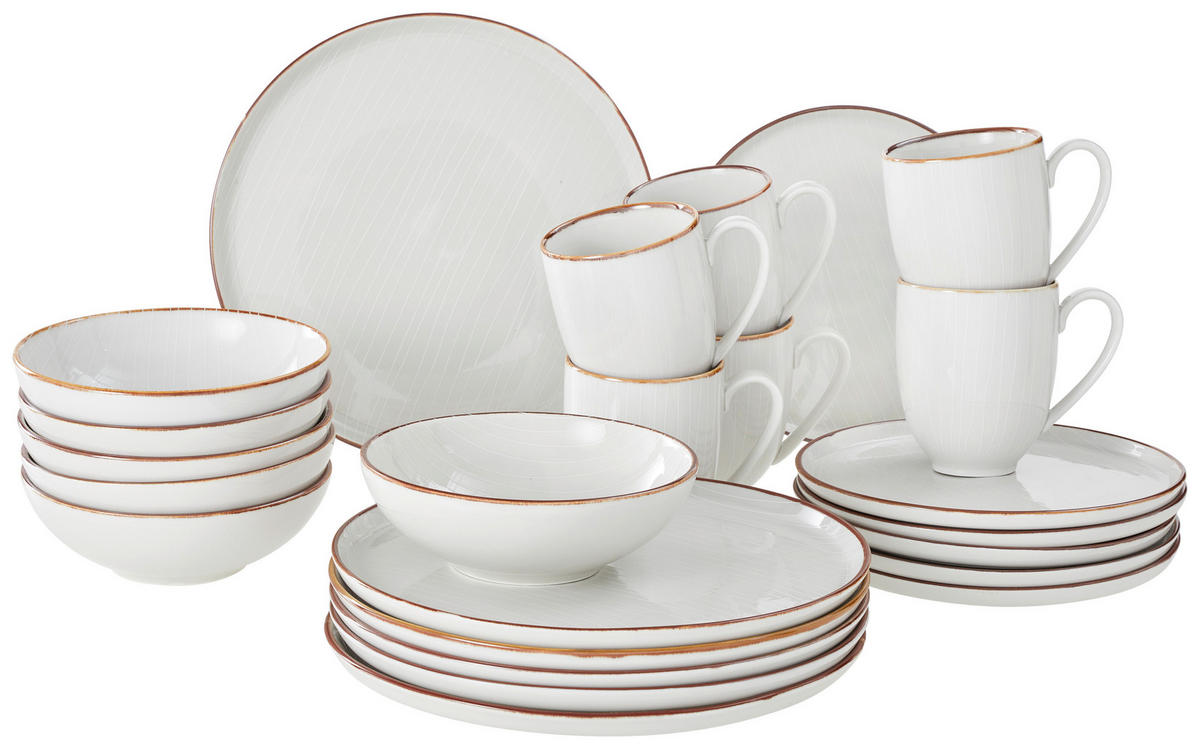Mit diesem Kombiservice für 6 Personen in Beige schmecken Ihre kulinarischen Kreationen gleich noch besser. Das 24-teilige Set besteht aus je 6 Speisetellern, Müslischalen, Kaffeebechern sowie Desserttellern. So haben Sie vom Frühstück über den Kaffee am Nachmittag bis hin zum Abendessen jederzeit das passende Teil zum Schlemmen parat. Praktisch: Zum Reinigen geben Sie das mikrowellen- und backofengeeignete Set einfach in die Spülmaschine.