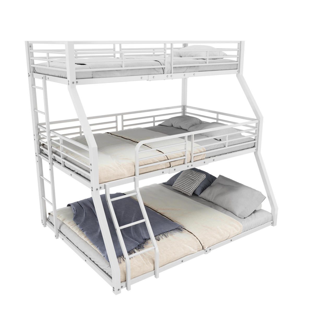 Bequemes und sicheres Design: Dieses Dreifach-Etagenbett ist mit zwei Leitern ausgestattet, die lange Leiter kann links und rechts installiert werden, und die kurze Leiter vom Erdgeschoss zum ersten Stock hat ein gebogenes Design, das es sicher und bequem macht, in die Etagen ein- und auszusteigen; das hohe Geländer am oberen Etagenbett bietet Kindern einen sicheren Schutz, so dass Eltern sich keine Sorgen über Sicherheitsfragen machen müssen.