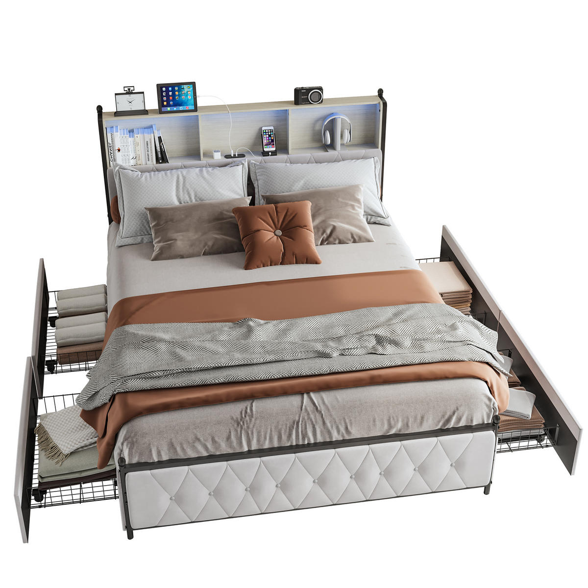 Im Kopfteil befinden sich drei praktische Ablagefächer für Bücher, Dekoration oder persönliche Gegenstände. Zusätzlich verfügt das Kopfteil über integrierte USB- und Type-C-Anschlüsse zum einfachen Laden von Smartphones oder Tablets.