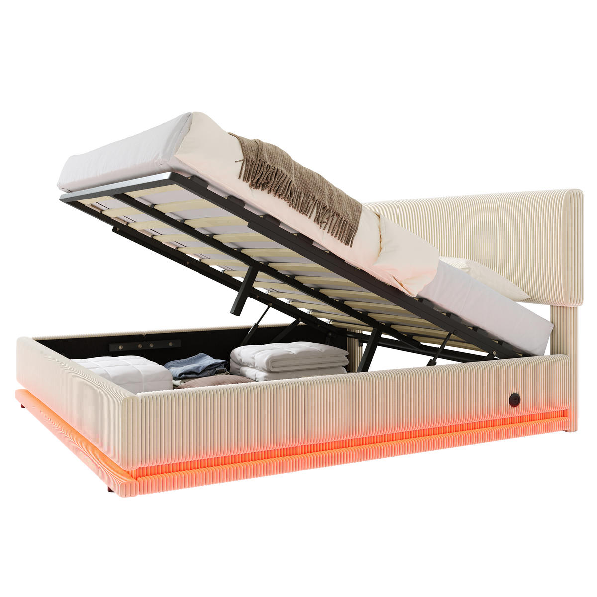 Das integrierte LED-Lichtsystem sorgt für sanfte, blendfreie Beleuchtung. Helligkeit und Farben lassen sich individuell einstellen, um unterschiedliche Stimmungen zu erzeugen – ideal für entspannte Abende, ruhige Nächte oder ein modernes Ambientelicht im Schlafzimmer.