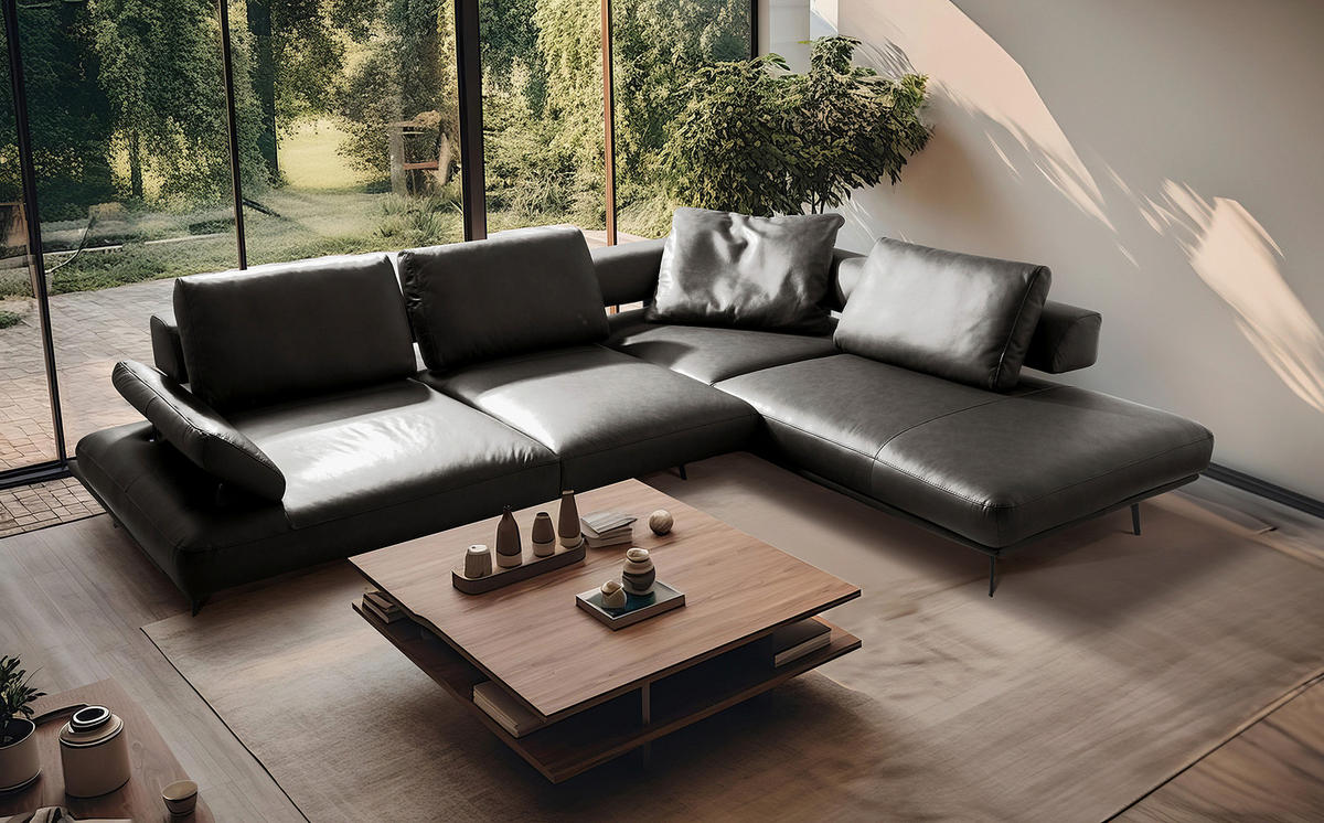 ECKSOFA Anthrazit Echtleder Rückenkissen, Rücken echt, Armteilverstellung, Sitzvorzug  - Anthrazit/Schwarz, Design, Leder/Metall (306/237cm) - Livetastic