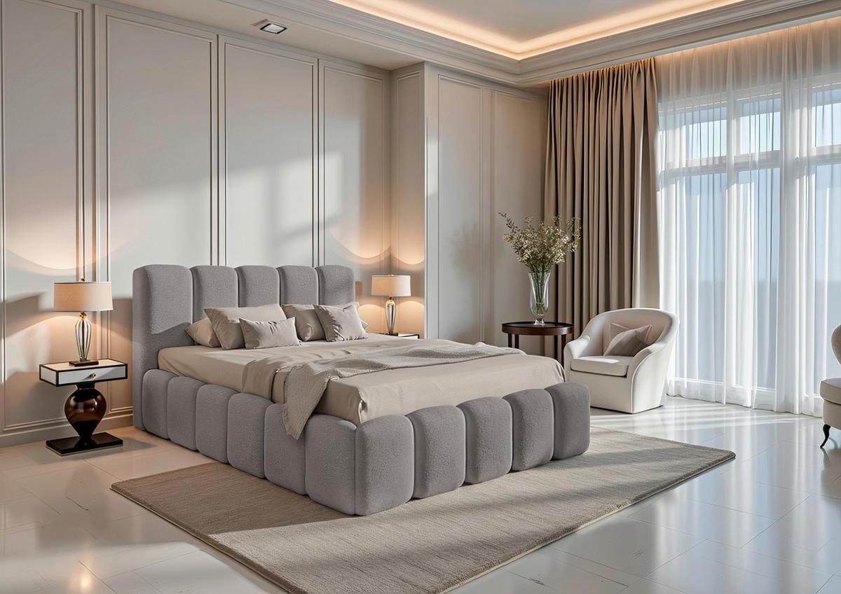 Ihre persönliche Interior-Ästhetik wird von dem Bett, hergestellt mit einem Synthetikfaser-Bezug (100 % Polyester), durch seine zurückgenommene Farbgebung in Grau widergespiegelt. Die