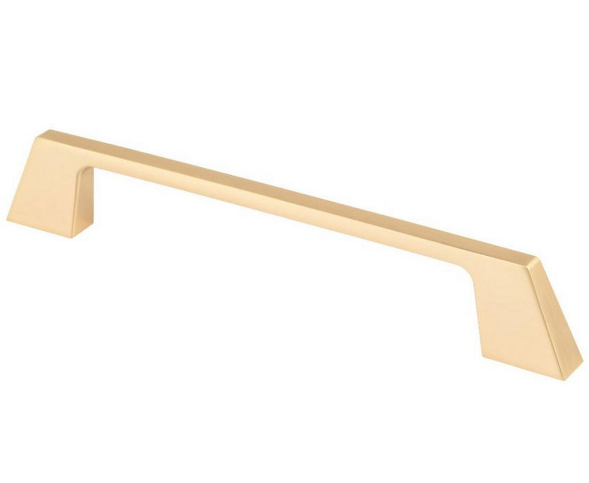Eleganter, eckiger Möbelgriff Stilo in warmem Goldton für Küchen- und Wohnmöbel. Die nach unten breiter werdenden Füßchen decken alte Bohrlöcher ab. Massive, stabile Ausführung, inklusive M4x25 mm Schrauben für 19–21 mm starke Möbelfronten.