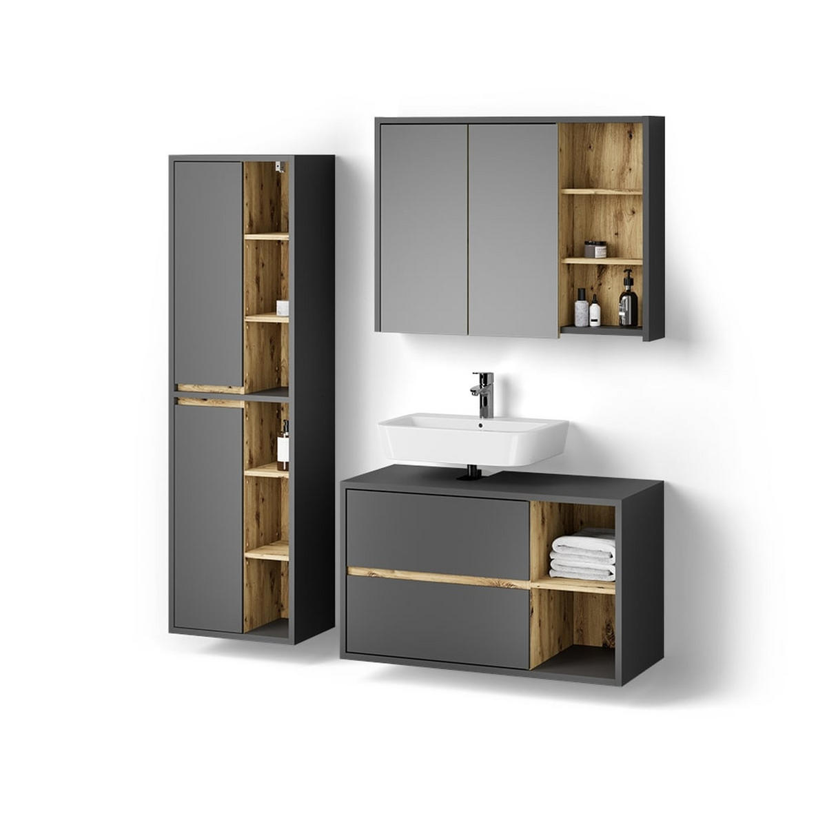 LIEFERUMFANG: Badspiegelschrank, Waschbeckenunterschrank, Hochschrank, (Dekoration nicht im Lieferumfang enthalten), Montageanleitung, Montagematerial.