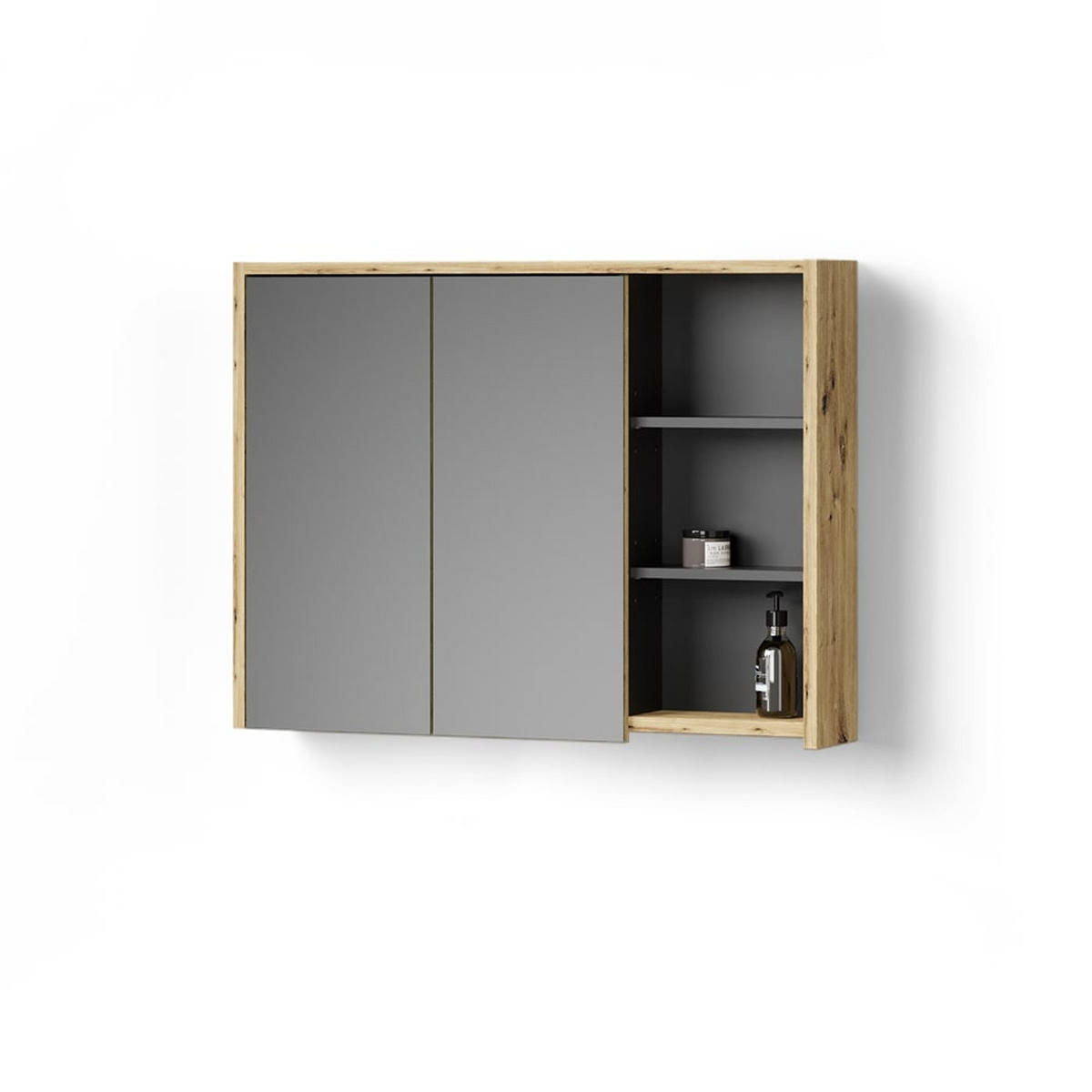 FUNKTIONAL: Unser Spiegelschrank verfügt über 2 Spiegeltüren und 3 offene Fächer, ideal für eine praktische und gut organisierte Aufbewahrung.