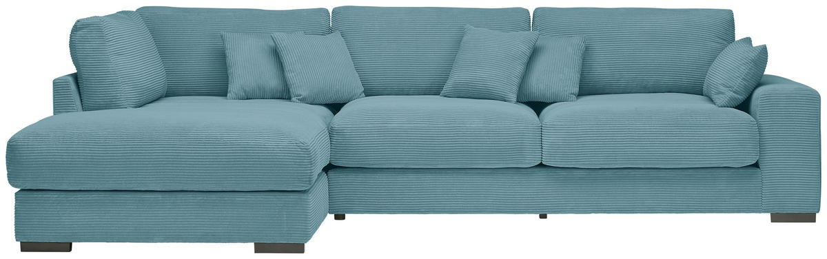 Können Sie sich etwas Besseres vorstellen als auf diesem hellblauen Ecksofa mit Cord-Bezug alles um sich herum zu vergessen?