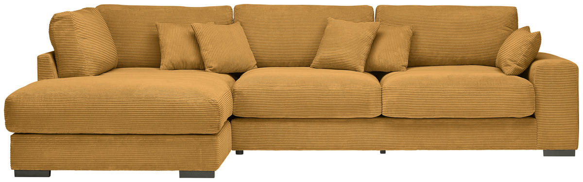 Rein in die Komfortzone: Dieses senfgelbe Ecksofa mit Cord-Bezug entführt Sie auf ein traumhaftes Terrain zum geruhsamen Durchatmen!