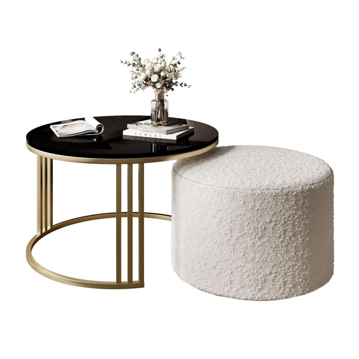 COUCHTISCH mit Hocker LORI Hochglanz gebürstetes Gold/Schwarz glänzend/Coral 65 - Schwarz, Metall (70/70/49cm) - LookwayLookway