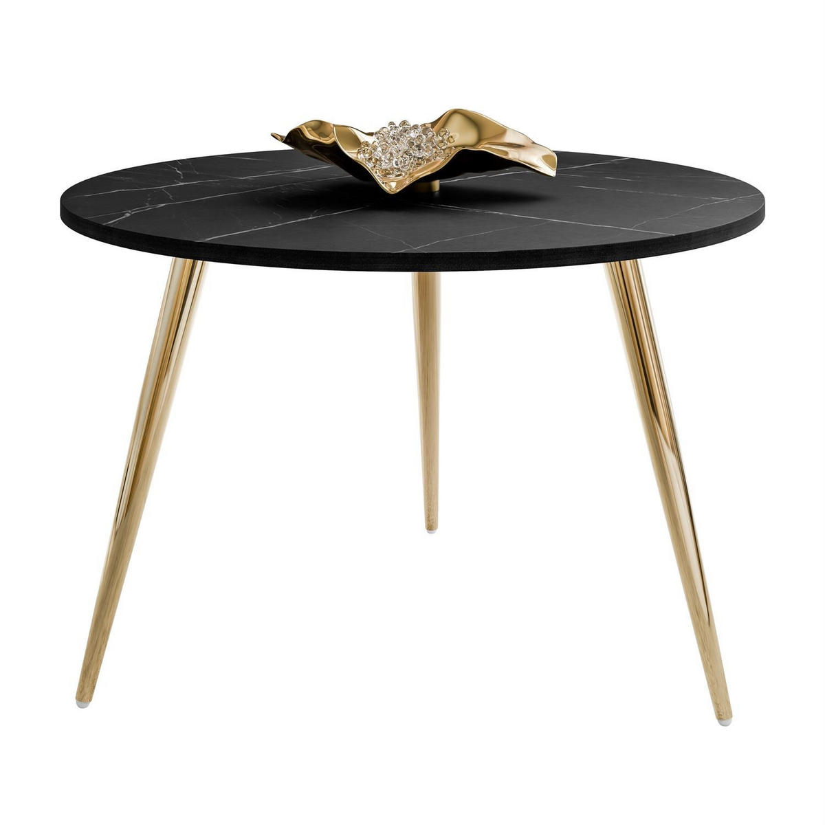 Die Konstruktion basiert auf schlanken Metallbeinen in Gold. Ihre schräge Anordnung sorgt für Stabilität des Tisches und verleiht ihm gleichzeitig visuelle Leichtigkeit. So wirkt das Möbelstück elegant und nimmt nicht übermäßig viel Platz ein, wodurch es die Sitzgruppe neben Sofa oder Sessel perfekt ergänzt.
