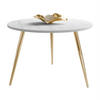 Die Konstruktion basiert auf schlanken Metallbeinen in Gold. Ihre schräge Anordnung sorgt für Stabilität des Tisches und verleiht ihm gleichzeitig visuelle Leichtigkeit. So wirkt das Möbelstück elegant und nimmt nicht übermäßig viel Platz ein, wodurch es die Sitzgruppe neben Sofa oder Sessel perfekt ergänzt.