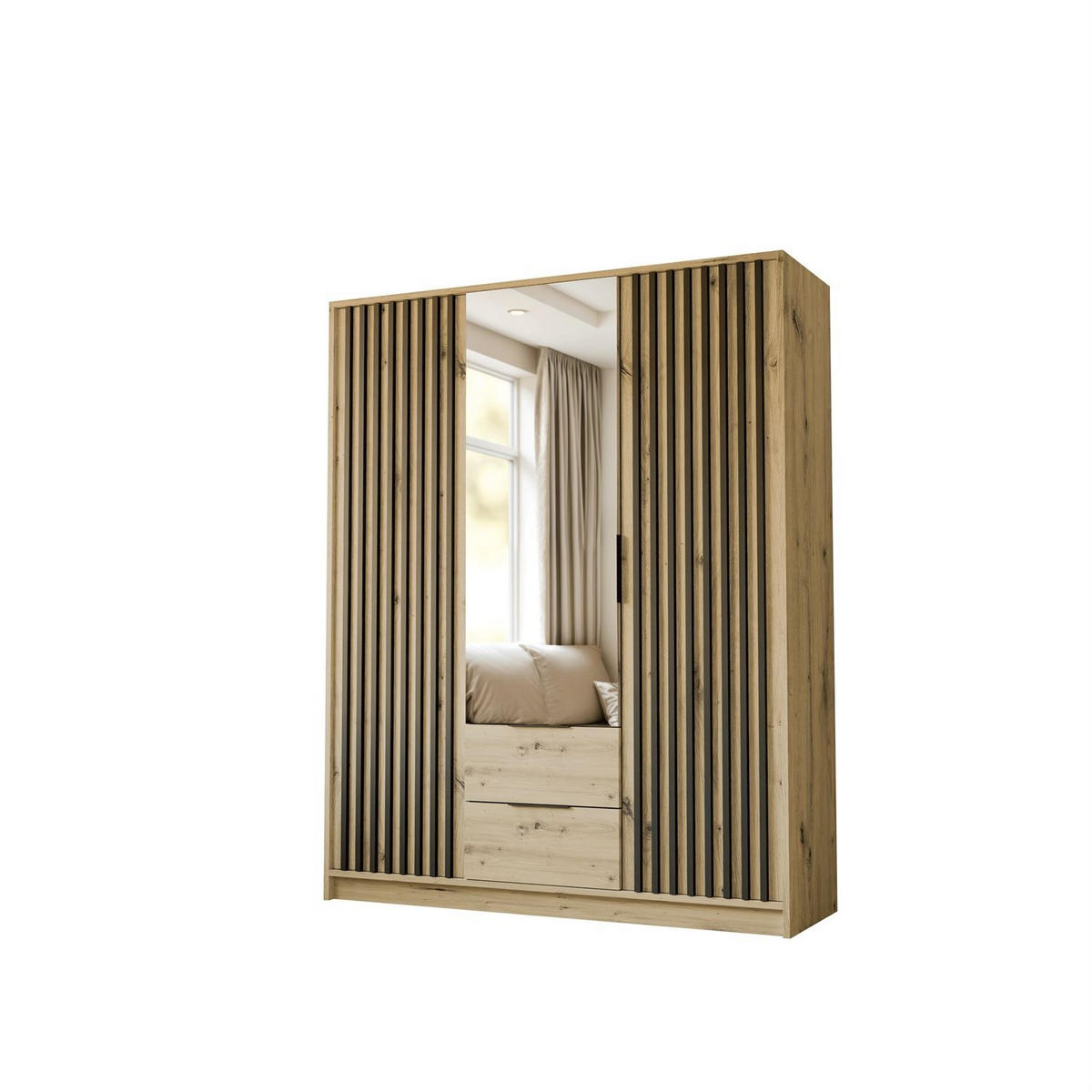 KLEIDERSCHRANK NELA, dreitürig mit Lamellen und Spiegel, 155 cm, Artisan/Schwarz - Eiche Artisan, Holzwerkstoff (155/200/51cm) - LookwayLookway