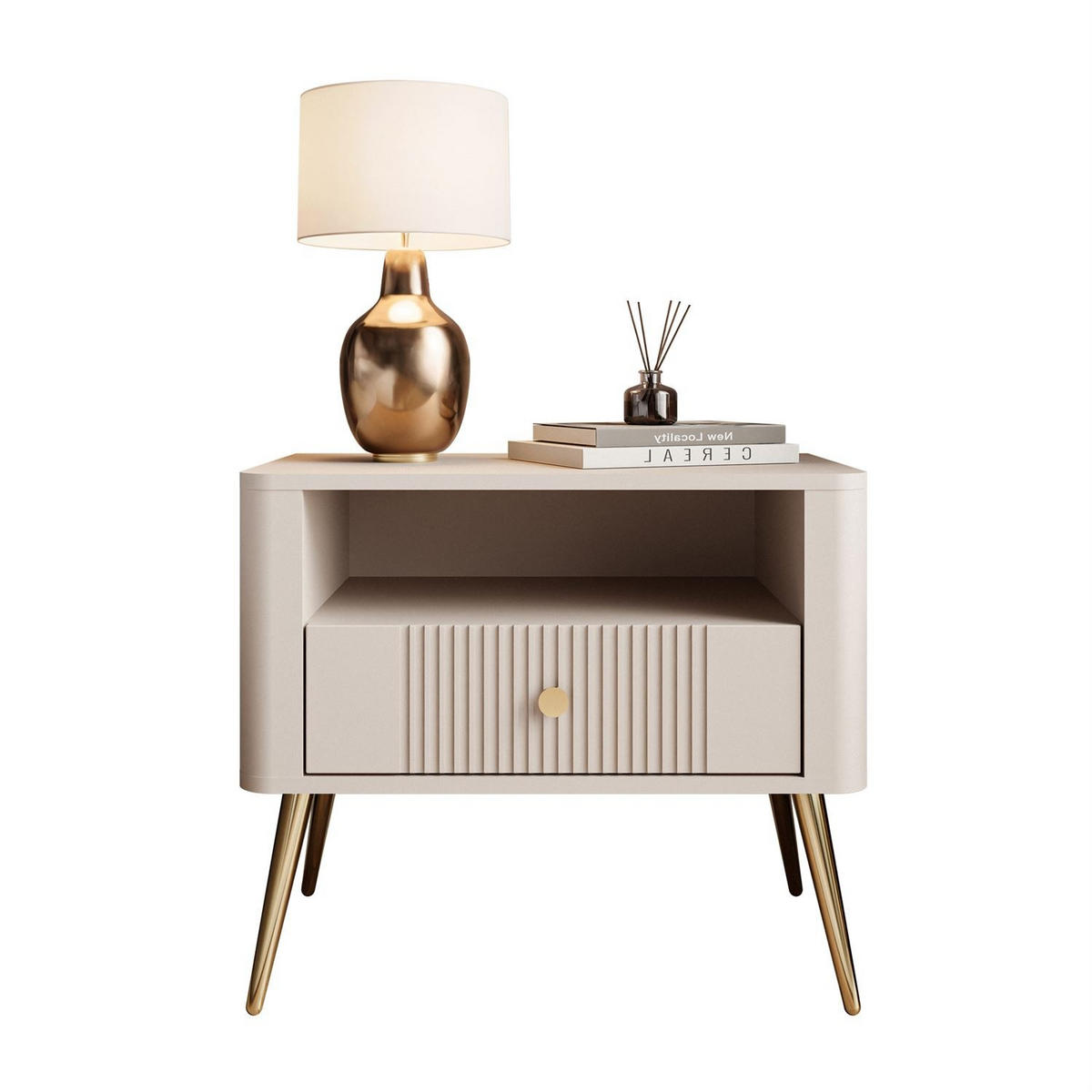 Der Nachttisch ELYSIA verbindet eine minimalistische Form mit einer luxuriösen Ausführung, inspiriert von aktuellen Einrichtungstrends. Die schlanke Konstruktion auf hohen Metallfüßen in Goldoptik verleiht dem Möbelstück Leichtigkeit und unterstreicht dezent seinen eleganten Charakter. Er ist die perfekte Ergänzung für Einrichtungen im Stil Modern Classic, Glamour oder Loft.