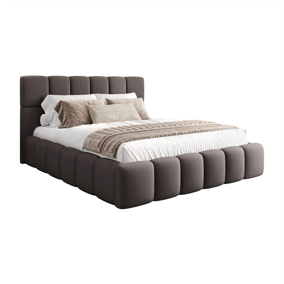Das Hauptmerkmal des Modells ist das dekorative Kopfteil sowie der Rahmen aus weichen, gewölbten Blöcken. Dadurch erhält das Ganze einen modernen und zugleich sehr leichten Charakter. Die weichen Paneele bilden eine sichere Konstruktion, die nicht nur hervorragend aussieht, sondern auch eine sehr bequeme Rückenlehne beim abendlichen Lesen oder Filme schauen bietet.