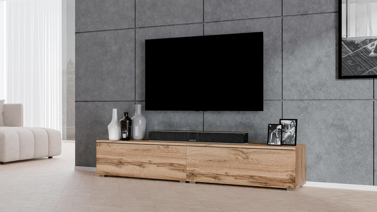Der Schrank für TV Loriano 2x100 cm kombiniert stilvolles Design und praktische Funktionalität. Die Eiche-Wotan-Optik verleiht Ihrem Wohnraum eine moderne und warme Atmosphäre.