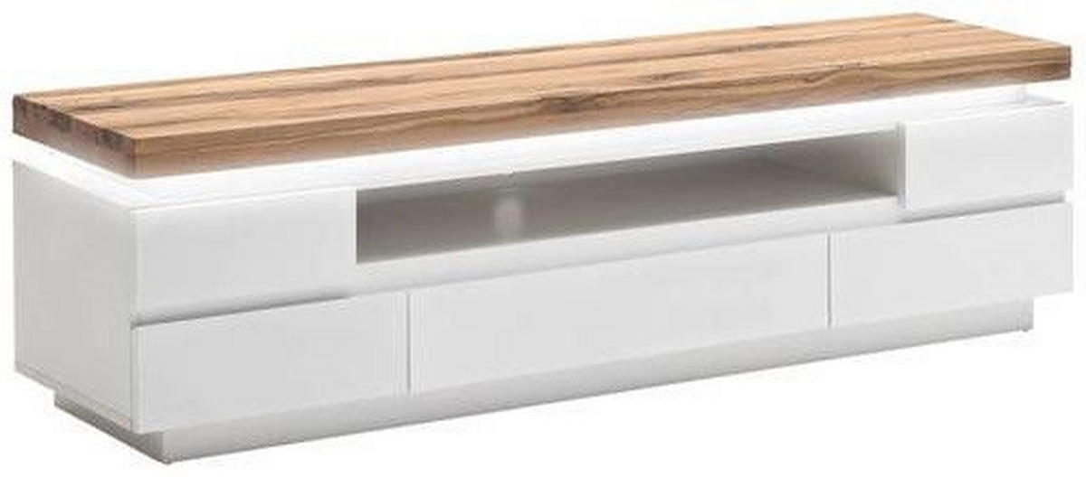 Das elegante Lowboard (B: ca. 175 cm) bietet viel Platz für Ihren Fernseher, Sat-Receiver oder DVD-Player. Außerdem profitieren Sie von 5 Schubladen. Eine dimmbare LED-Beleuchtung ist im Lieferumfang enthalten und setzt tolle Akzente. Die vollmassive Abdeckplatte ist durch Eichenholz mit natürlichem Strukturverlauf geprägt. Korpus und Front in trendigem Weiß machen das Lowboard zum vielseitigen TV-Element für Ihr Wohnzimmer!