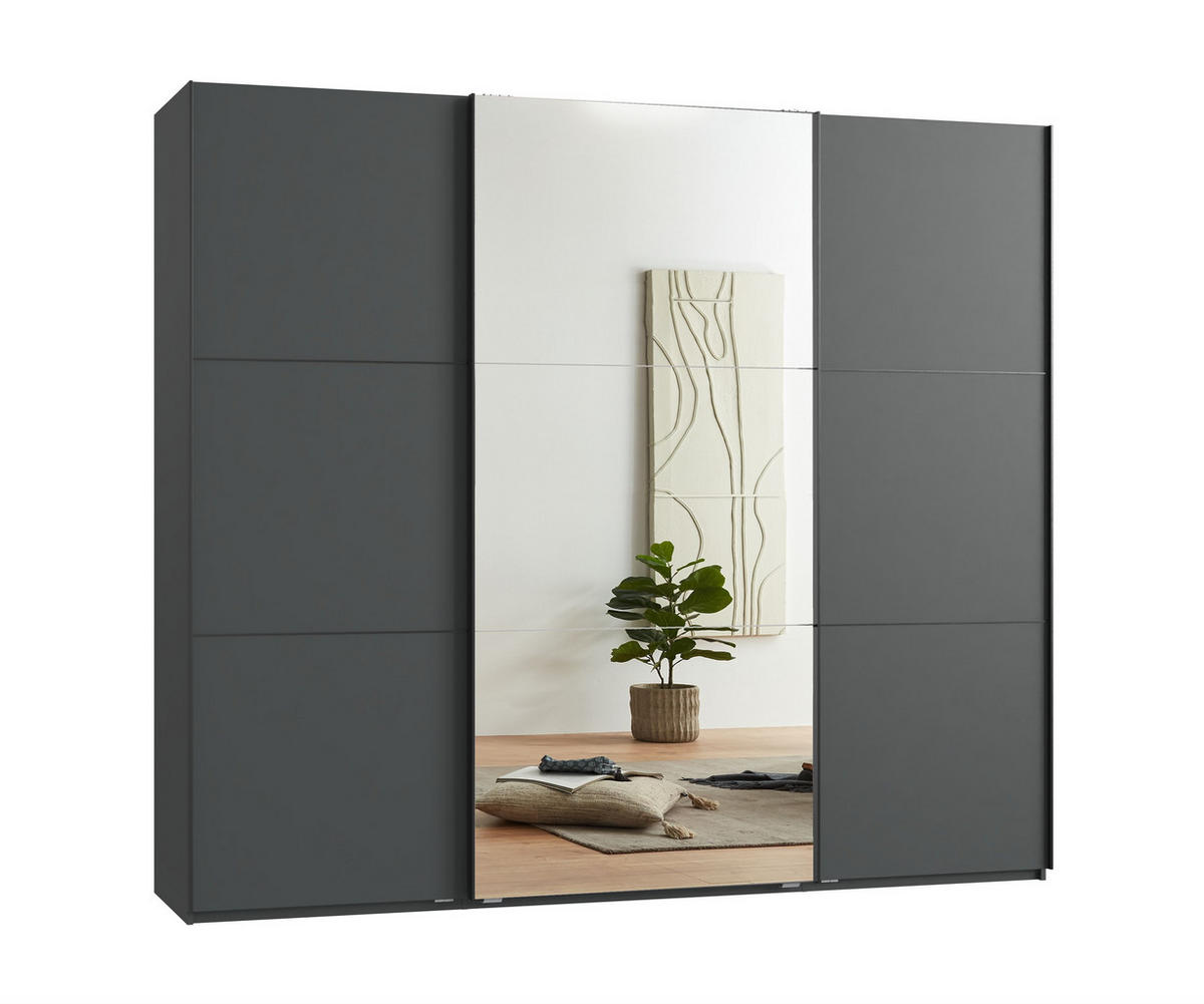 - Schwebetürenschrank mit 3 Türen, die äußeren Türen in Anthrazit, die mittlere Tür mit Spiegel