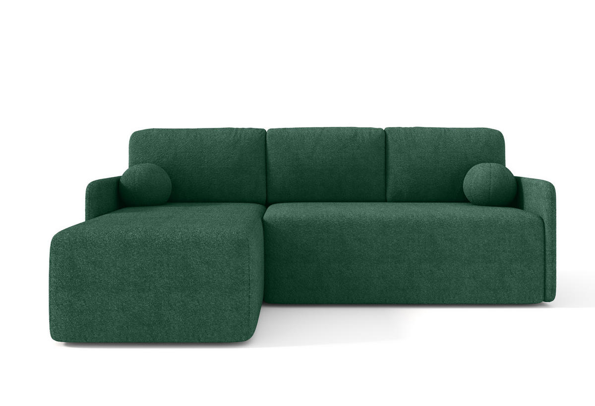 Ein vielseitiges Modell, das perfekt in Ihr Wohnzimmer passt. Die Ecke verfügt über eine Schlaffunktion und einen Behälter für Bettwäsche. Es besteht aus dem ikonischen BOUCLE-Stoff. Im Vergleich zur Mango-Kollektion zeichnet es sich durch eine runde Form und ein längliches, großes Rückenpolster aus.