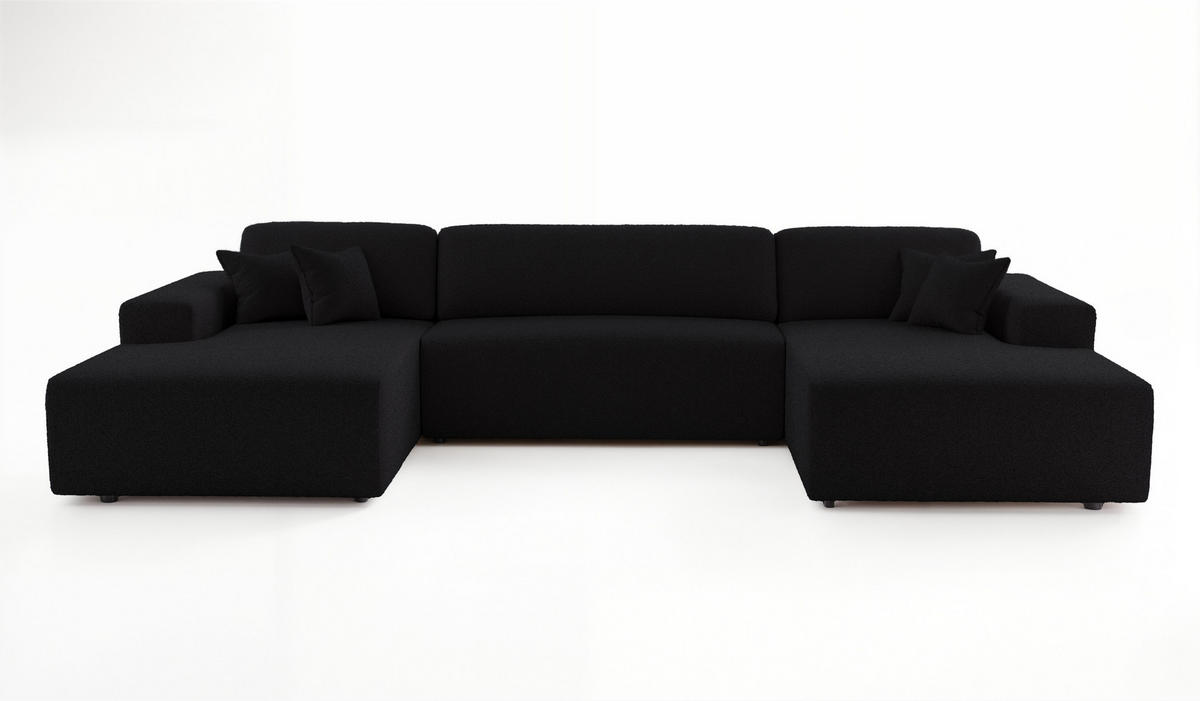Ein vielseitiges Modell, das perfekt in Ihr Wohnzimmer passt. Die Wohnlandschaft verfügt über eine Schlaffunktion und einen Behälter für Bettwäsche. Sie besteht aus dem ikonischen Boucle-Stoff. Im Vergleich zur Mango-Kollektion zeichnet sie sich durch eine runde Form und ein längliches, großes Rückenpolster aus.