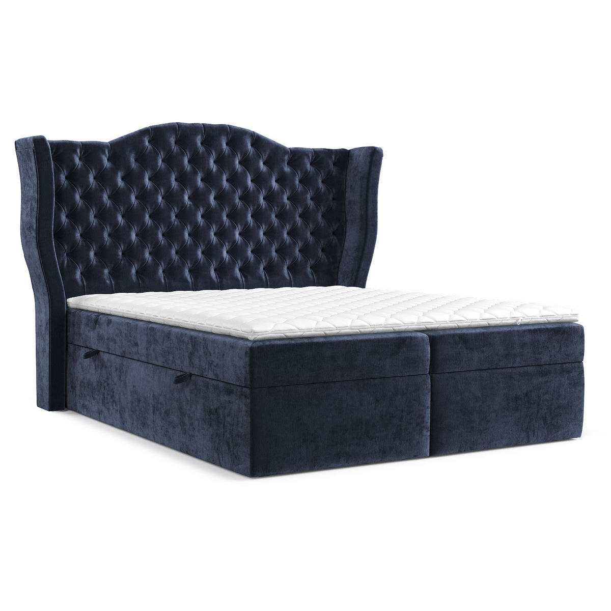 Das geräumige, seitlich zu öffnende Fach eignet sich perfekt zur übersichtlichen Aufbewahrung von Bettwäsche und anderen wichtigen Dingen. Mit seinem beeindruckend glamourösen Design und der robusten Konstruktion ist Royal ein Bett, das ebenso stilvoll wie praktisch ist.