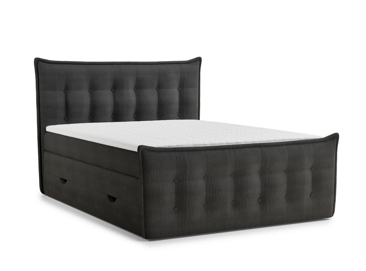 Fatu ist ein Boxspringbett, das sofort ins Auge fällt. Das liegt an dem gesteppten Kopfteil und der Front sowie den leicht abgerundeten Kanten, die ihm ein weiches, gemütliches Aussehen verleihen.