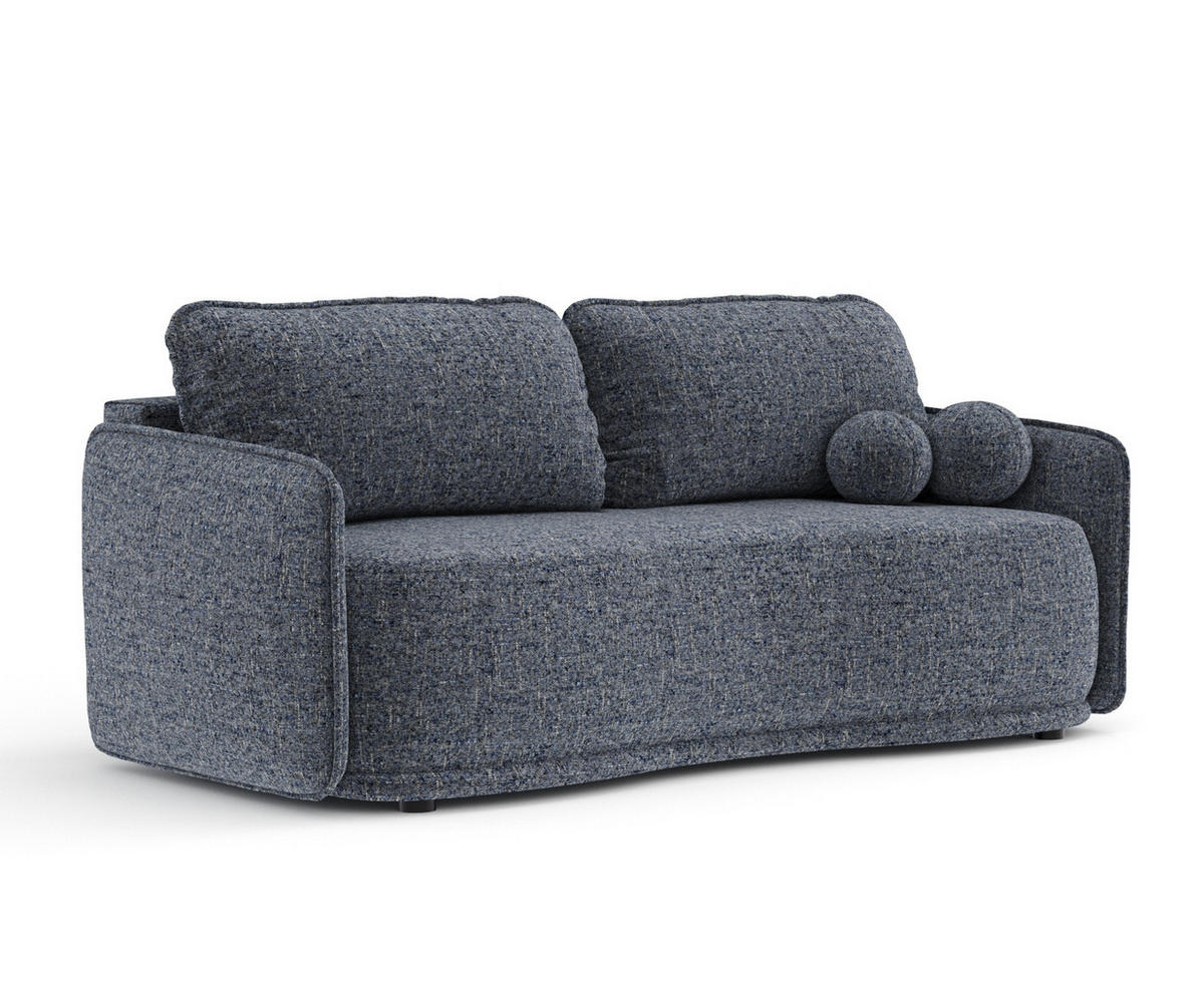 Mitsis ist auch praktisch: Der eingebaute Stauraum ist ideal, um Decken oder Kissen zu verstauen. Das Sofa ist perfekt für kleine Räume und bietet Funktionalität und Stil in einem. Zwei runde Zierkissen geben dem Sofa eine gemütliche Note.