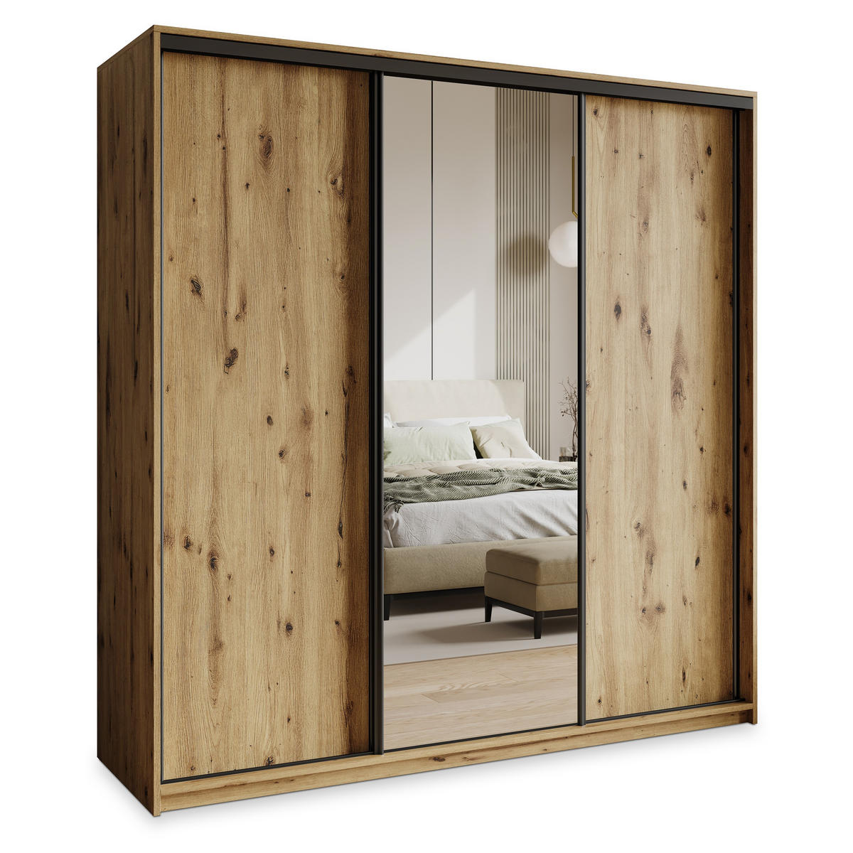 SCHWEBETÜRENSCHRANK TAVI 200/205/60 cm 3-türig mit Spiegel Eiche Artisan - Eiche Artisan, Holzwerkstoff (200/205/60cm) - MASSENO