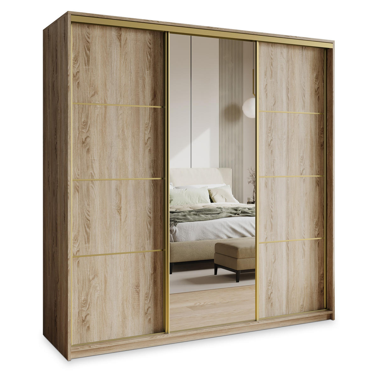 MASSENO SCHWEBETÜRENSCHRANK VARO 200/205/60 cm 3-türig mit Spiegel Sonoma Eiche