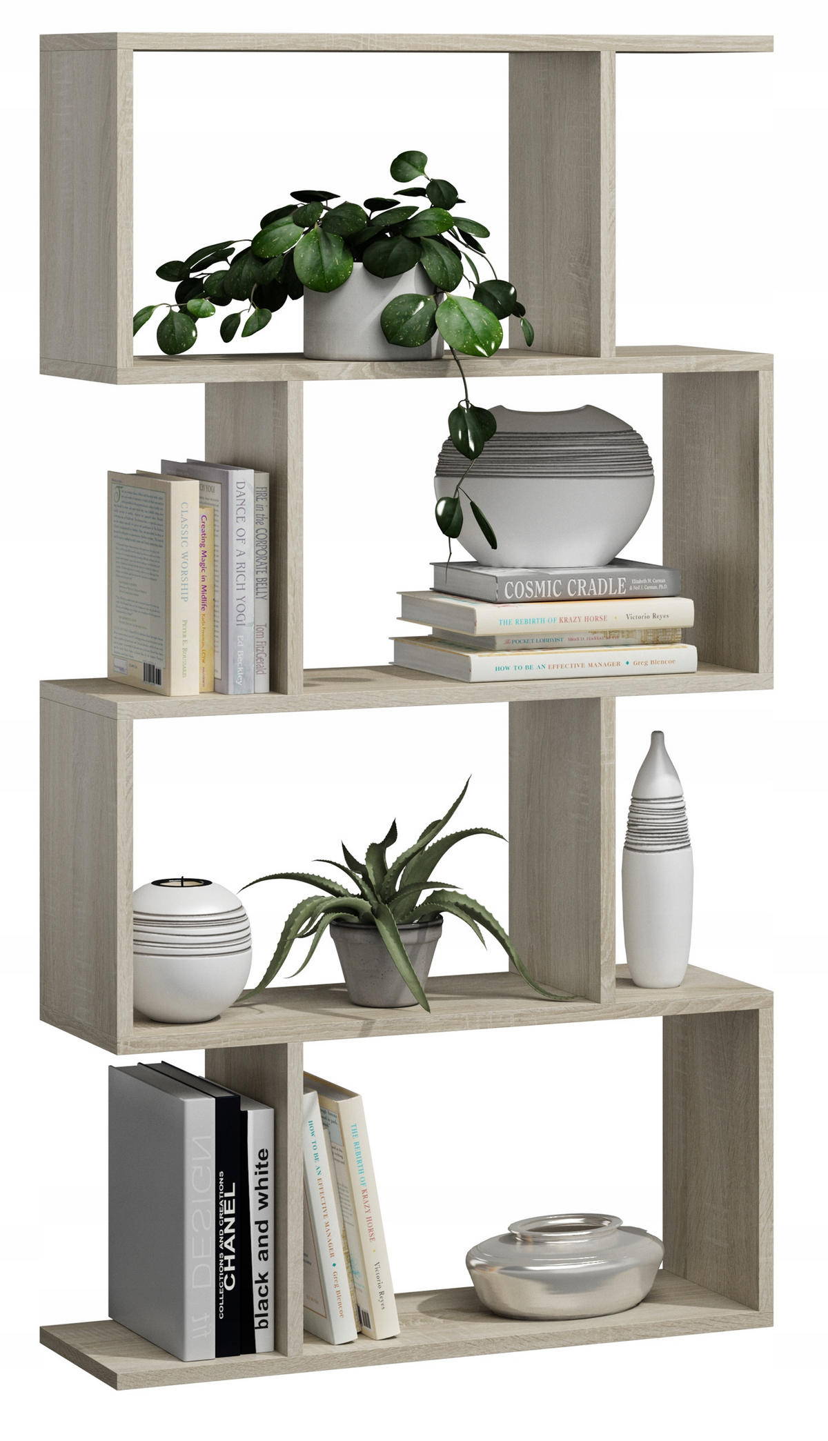 Info zu diesem Artikel - Dynamische Optik: Die links- und rechtsseitig verschobene Regalablagen bringen eine unglaubliche Dynamik in den Raum. Mit entsprechender Dekoration wird das Bücherregal zu einem optischen Blickfang im Raum.