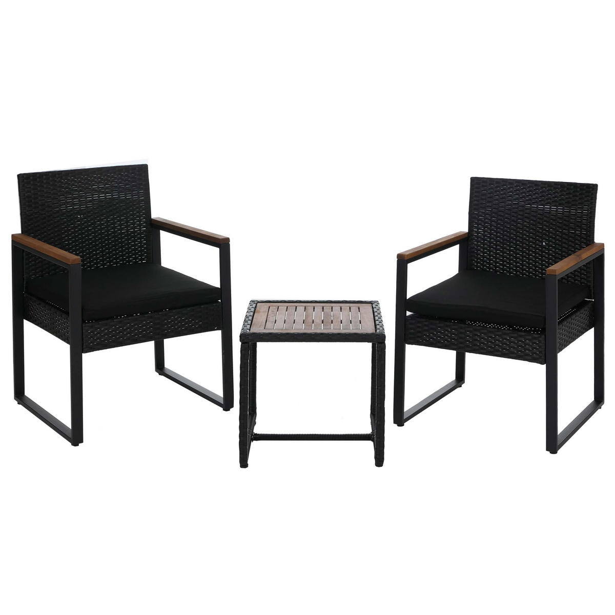 - Dieses Set mit zwei Stühlen und einem Tisch verbindet modernes Design mit hoher Funktionalität - ideal für Garten, Terrasse oder Balkon. Die Kombination aus Polyrattan und Holz schafft eine elegante Atmosphäre und lädt zu entspannten Stunden ein.