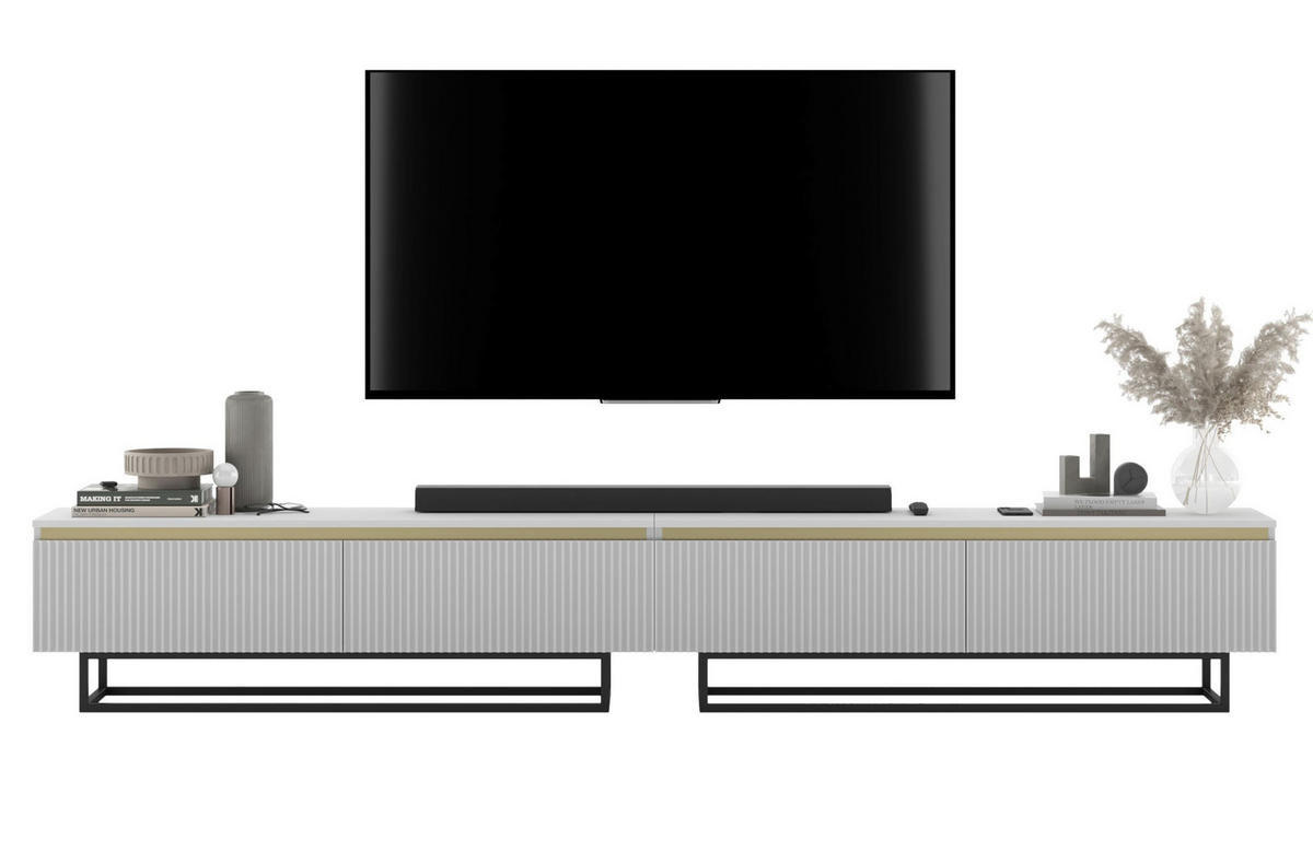 Ein Set aus zwei modernen TV-Schränken, die zusammen eine stimmige und stilvolle Einheit bilden. Gemeinsam bieten sie vier geräumige, verschließbare Fächer, die viel Stauraum und hohe Funktionalität gewährleisten. Die Schränke sind nebeneinandergestellt und ergeben ein langes, beeindruckendes Möbelstück, das sich hervorragend in moderne Innenräume einfügt. Die gesamte Konstruktion steht auf Metallgestellen, was dem Möbel Leichtigkeit und einen zeitgemäßen Charakter verleiht und zugleich Stabilität und Langlebigkeit sichert.
