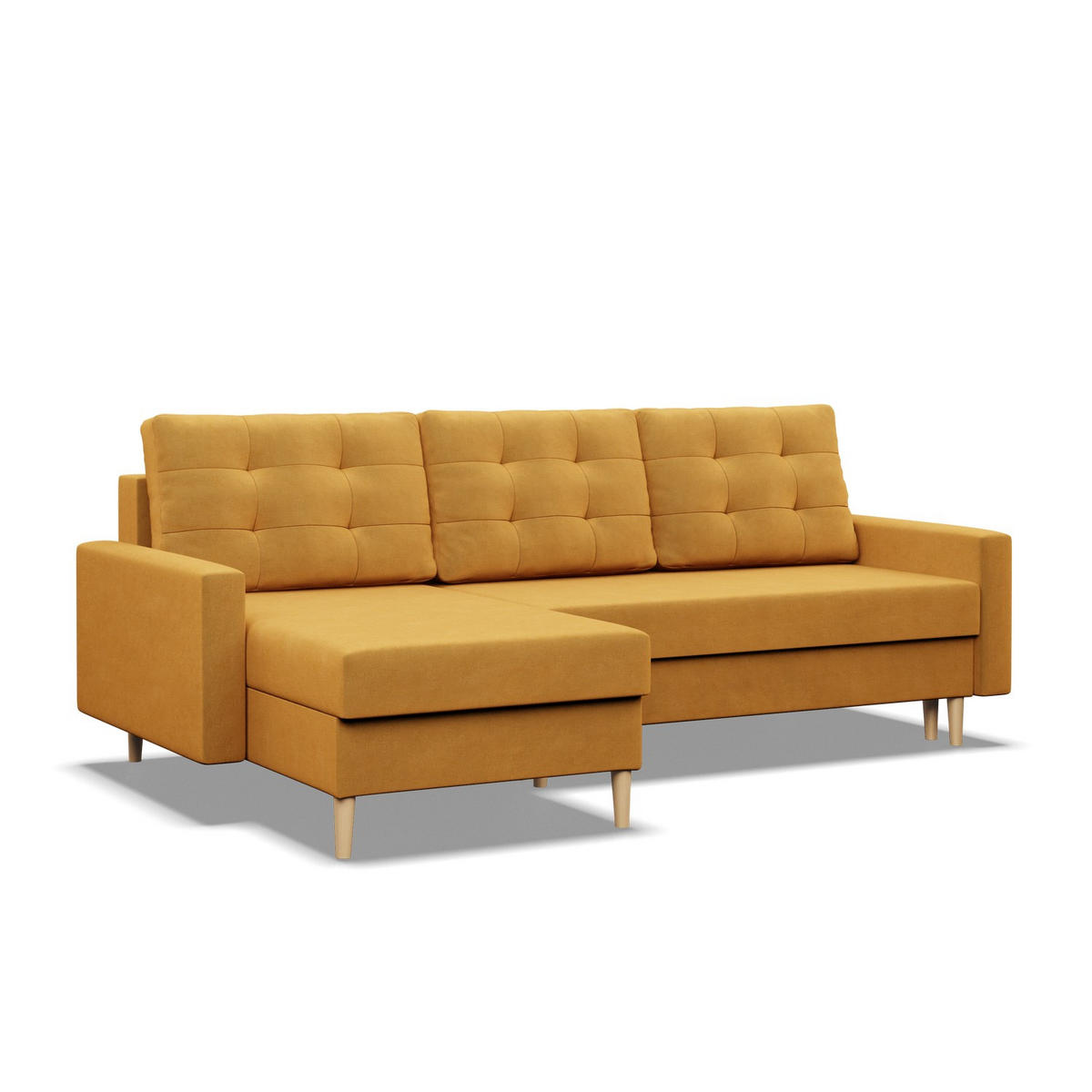 In dem im Sitz versteckten Behälter können Sie Bettwäsche und andere Einrichtungsgegenstände aufbewahren. Mit dieser Lösung erhalten Sie ein freistehendes Multitasking-Möbelstück, das mit 3 weichen, aber flexiblen Kissen ausgestattet ist. Jedes Kissen des ausklappbaren Ecksofas ist lose, sodass Sie es frei bewegen können, um bei einer Hausparty oder beim Fernsehen bequem zu sitzen oder zu liegen. Jedes Kissen ist doppelseitig: glatt auf der einen Seite und gesteppt auf der anderen Seite. Dadurch können Sie das Aussehen Ihres Ecksofas frei verändern.