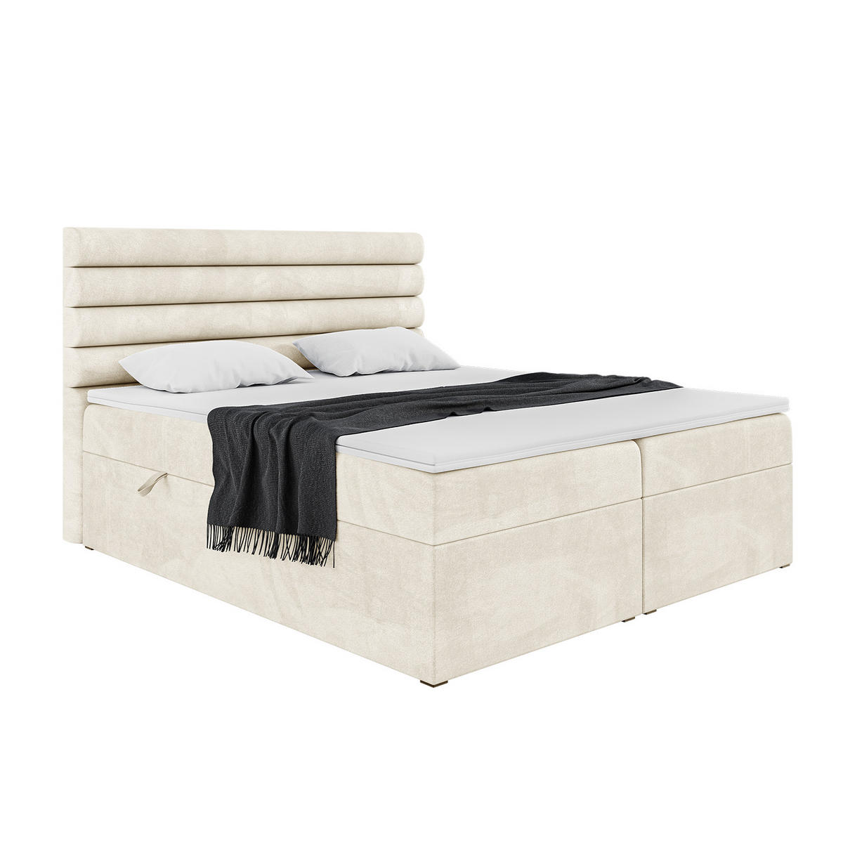 [LIEFERUNG ERFOLGT NUR BIS ZU BORDSTEINKANTE] [ROBUST UND KOMFORT AUF KÖNIGLICHE WEISE]- Vergessen Sie andere Boxspringbetten - auf unserem Boxspringbett werden Sie wie ein König/eine Königin schlafen, denn es wurde speziell für die anspruchsvollsten Benutzer entwickelt. Das KARIM-Doppelbett kombiniert ein robustes und gediegenes Design, außergewöhnlichen Schlafkomfort und eine clevere Konstruktion, die wertvollen Platz im Haushalt spart [KOMFORTABLE MATRATZE UND TOPPER]- Das Polsterbett hat eine eingebaute mehrschichtige Premium Federkernmatratze (780 Federn/m2) H4 Härte mit 7 Härtezonen, die sich der Körperform anpasst, um einen angenehmen Schlaf zu gewährleisten und die Wirbelsäule zu entlasten. Die Matratze ist nicht alles, zum Set gehört auch ein 4 cm hoher Schaumstoff-Topper, der Ihnen das Gefühl gibt, auf einer Wolke zu schlafen [LANGLEBIGER POLSTERSTOFF]- Die Strapazierfähigkeit des Schlafbetts wird durch das abriebfeste Matt Velvet-Gewebe gewährleistet, das nicht nur eine schöne Textur hat, sondern sich auch angenehm anfühlt, seine Farbe nicht verliert und nicht schmilzt. Das elegante Kopfteil ist ein subtiles Design-Detail, das Ihr Auge erfreut und Sie bei einem Abend mit einem Buch oder Ihrer Lieblingsserie bequem unterstützt [SMART STAURAUM UND HALBAUTOMATISCHER FEDERMECHANISMUS]- Das Bett mit Stauraum verfügt über zwei seitlich zu öffnende Bettkasten mit integriertem Federmechanismus, so dass Sie diese mühelos durch Ziehen an den Textilgriffen öffnen können. Im Bettkasten können Sie Bettwäsche aufbewahren, z.B. Kissen, Bettdecke, Decke oder Bettüberwurf, die Ihr Schlafzimmer ordentlich halten Verpackung:
